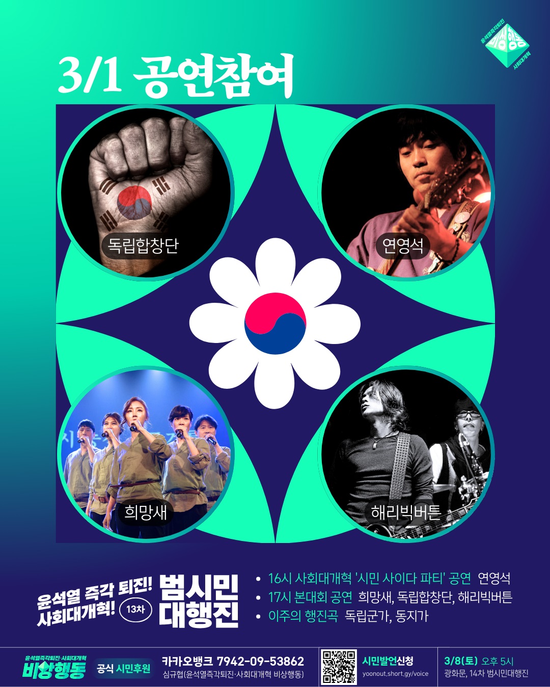 3월1일(토) 5시 광화문 윤석열 즉각 퇴진 13차 범시민대행진 집회 일정