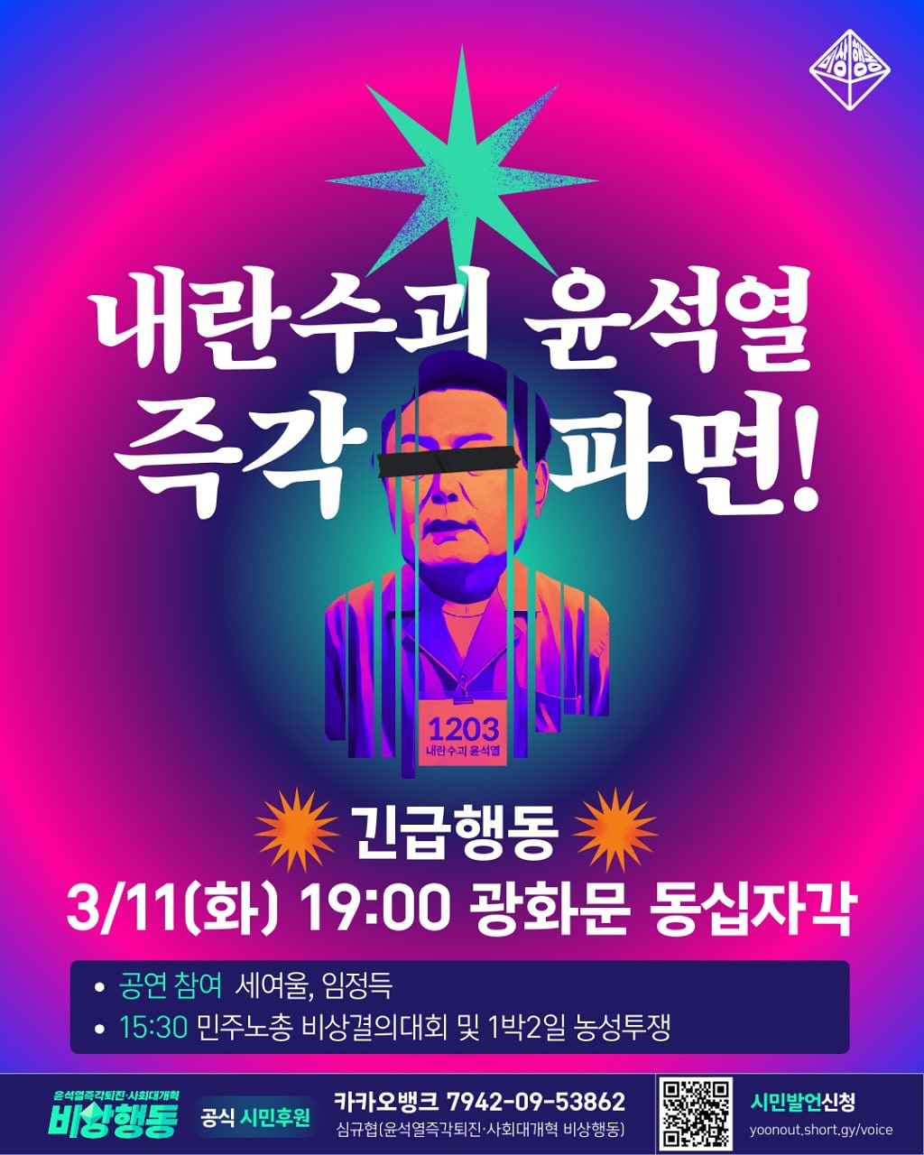 서울 3월11일(화) 7시 광화문 동십자각 윤석열 파면 촉구 비상행동 매일집회