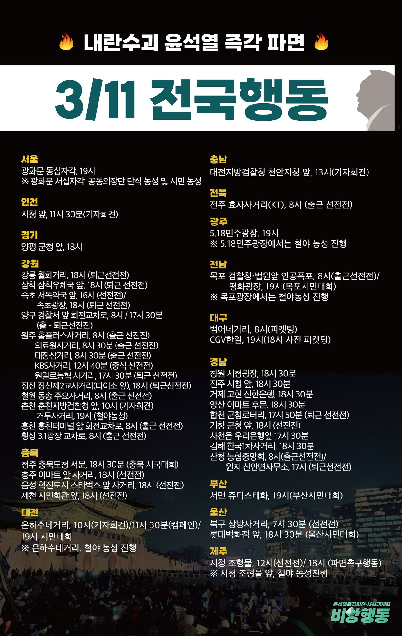 3월11일(화) 윤석열 탄핵 촛불집회 전국 일정