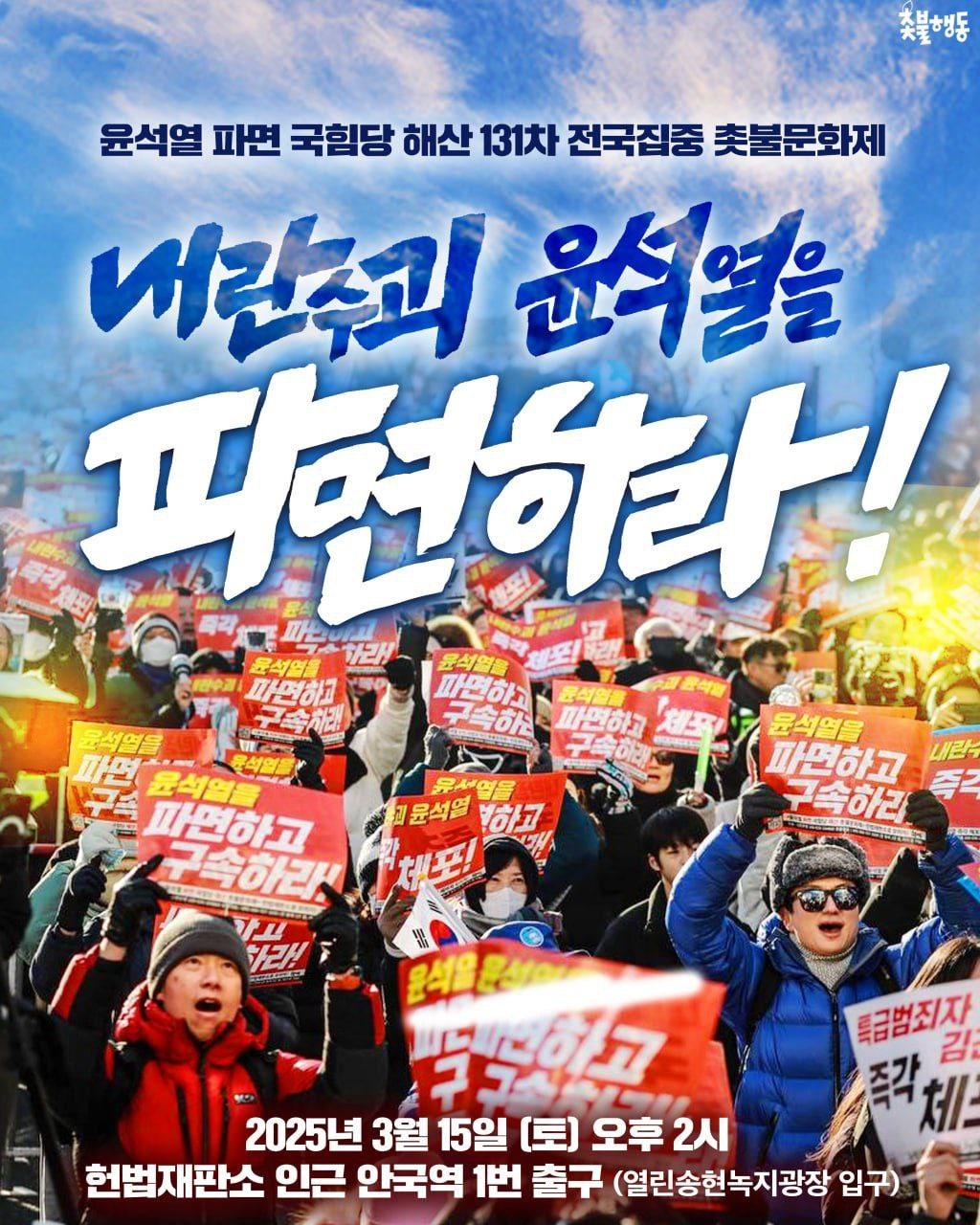 3월15일(토) 2시 안국역 1번 출구 윤석열 파면 131차 전국집중 촛불문화제 집회 일정