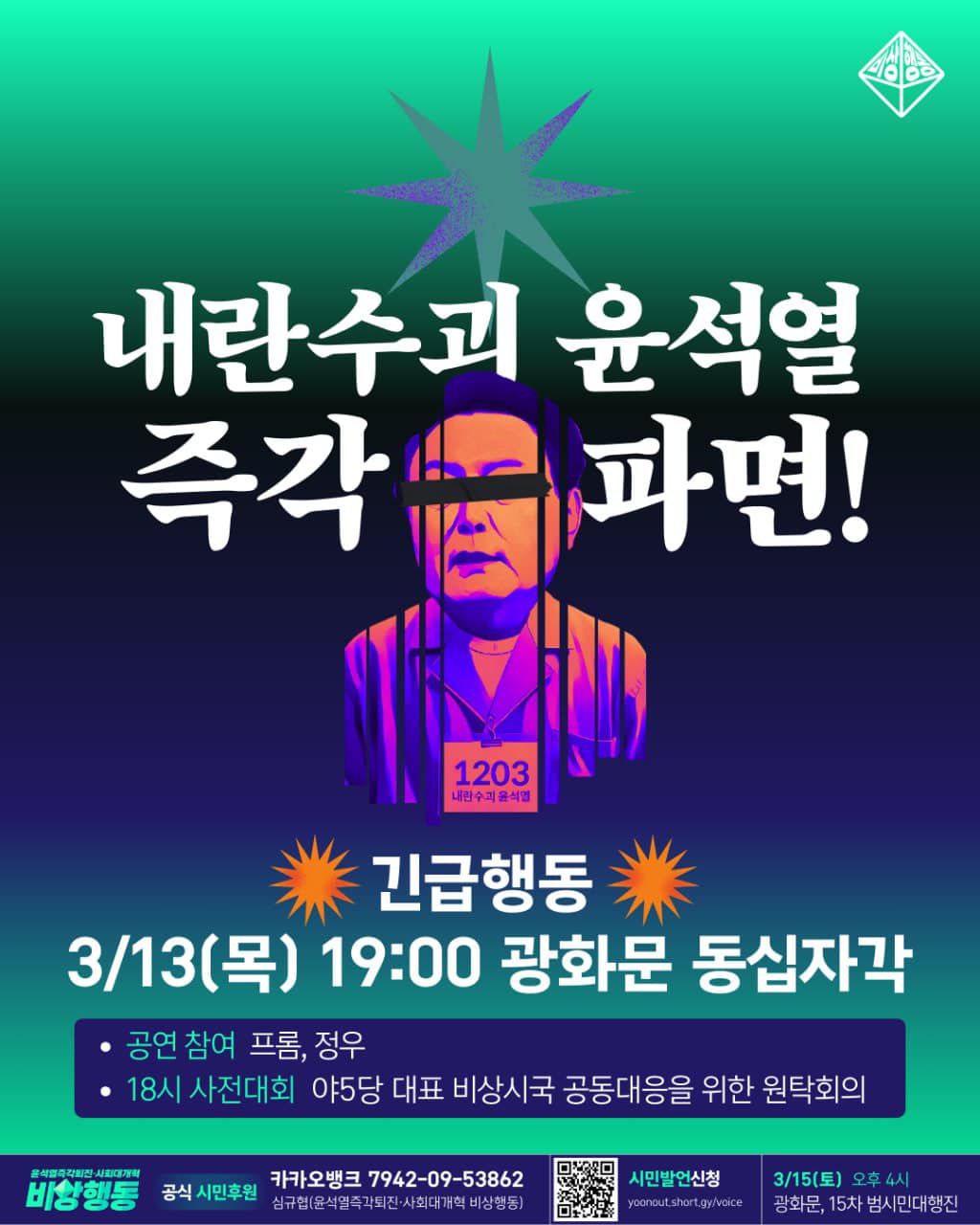 | 서울 3월15일(토) 4시 광화문 윤석열 즉각 퇴진 15차 범시민대행진 집회 일정 (0) | 2025.03.12 |
