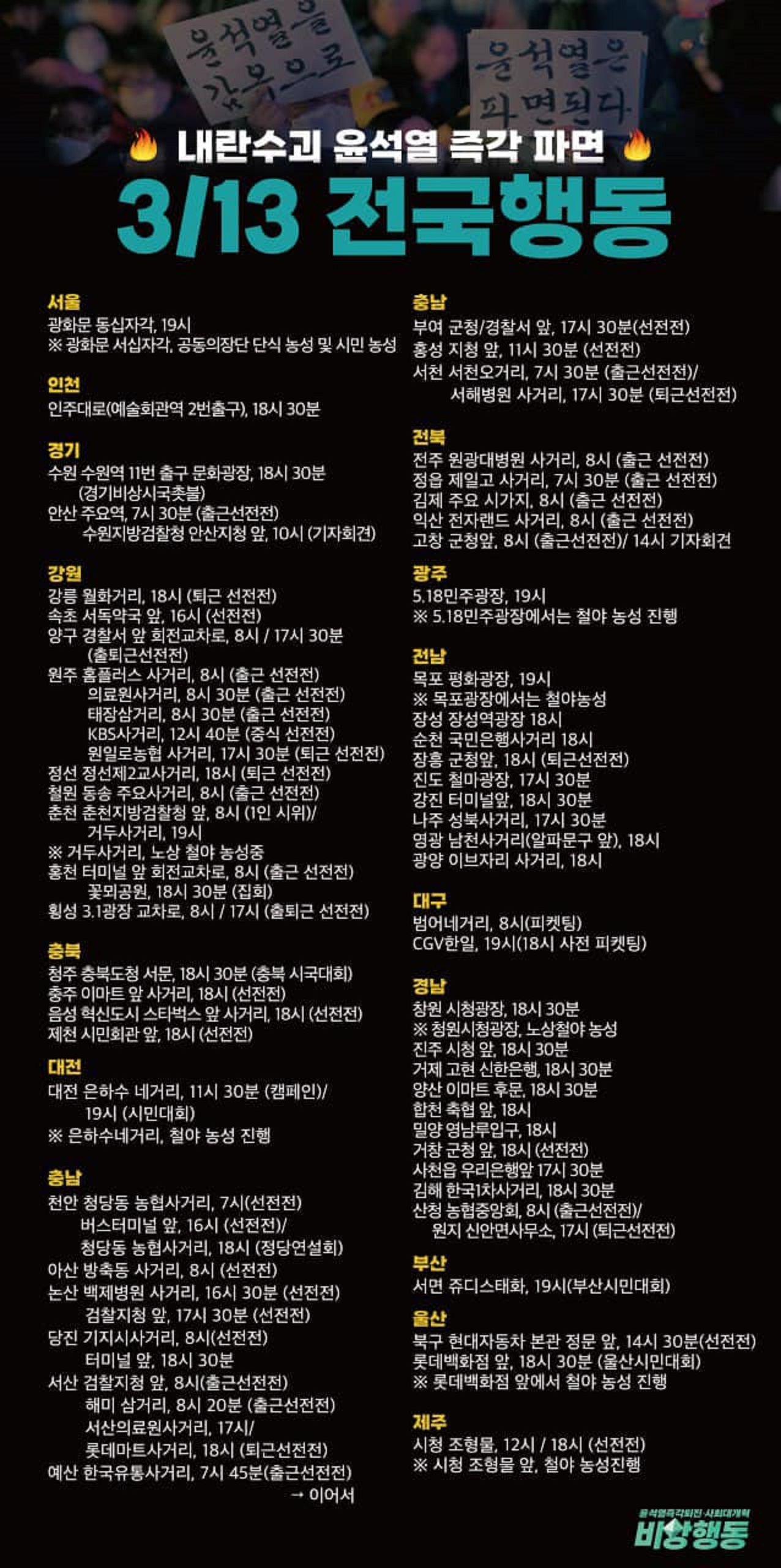 3월13일(목) 윤석열 탄핵 촛불집회 전국 일정