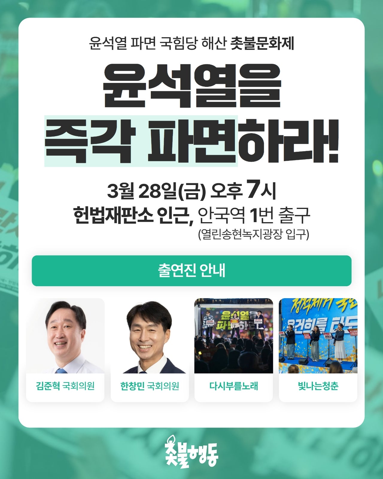 서울 평일 7시 열린송현녹지광장 입구 (안국역 1번 출구) 윤석열 파면 국힘당 해산 촛불문화제