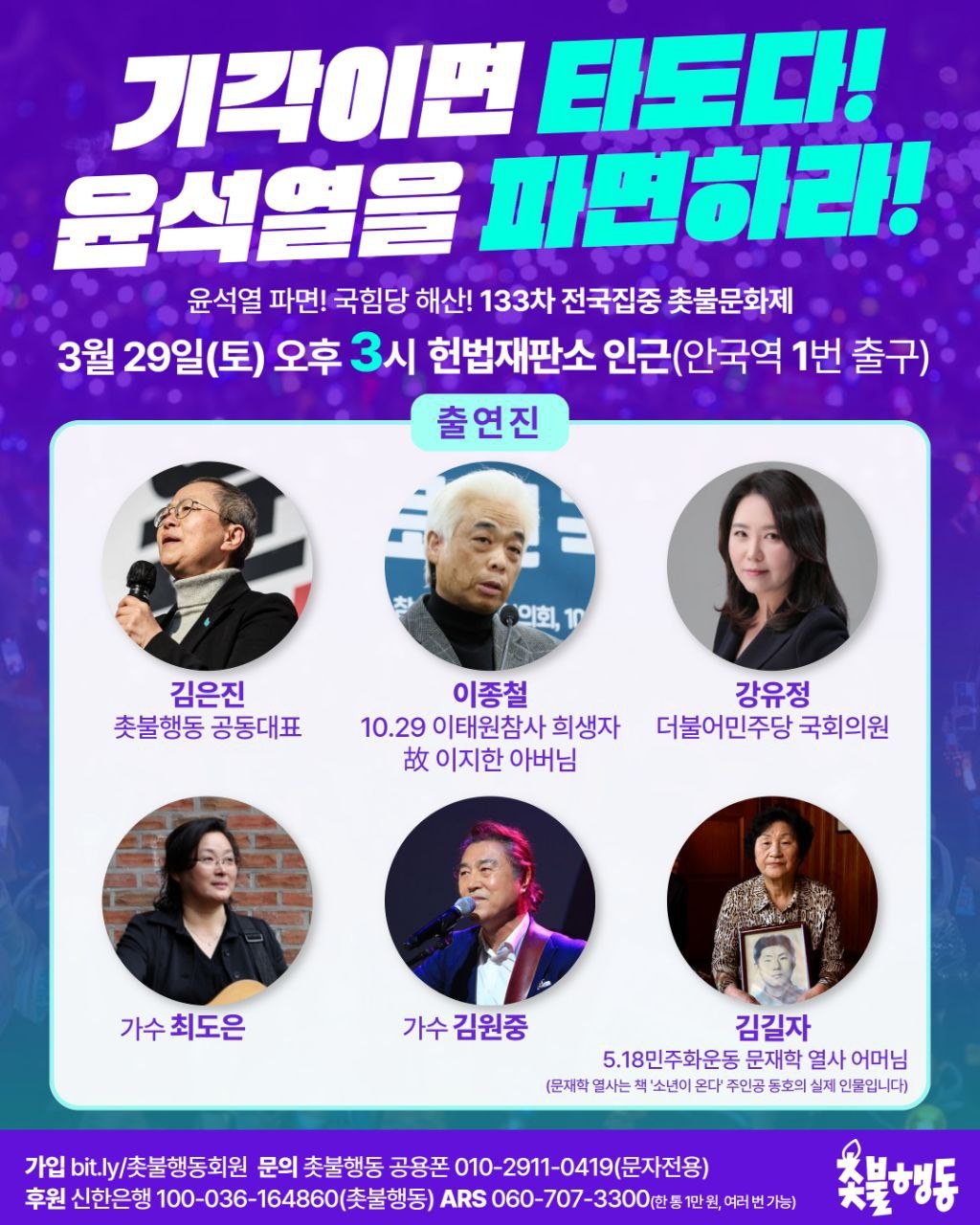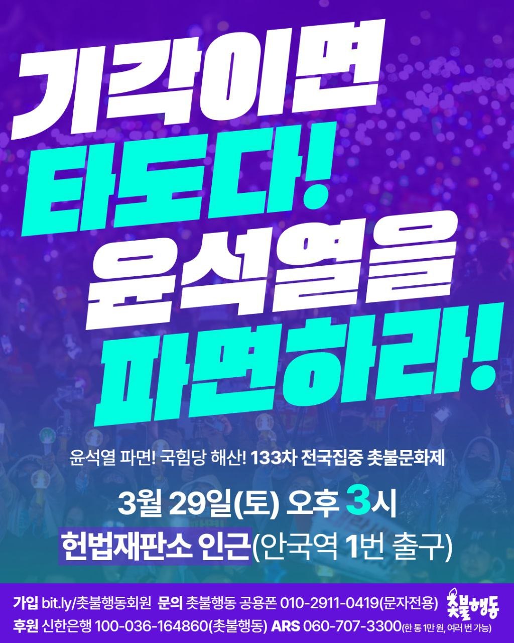 3월29일(토) 3시 안국역 1번출구 윤석열 파면 133차 전국집중 촛불문화제 집회 일정
