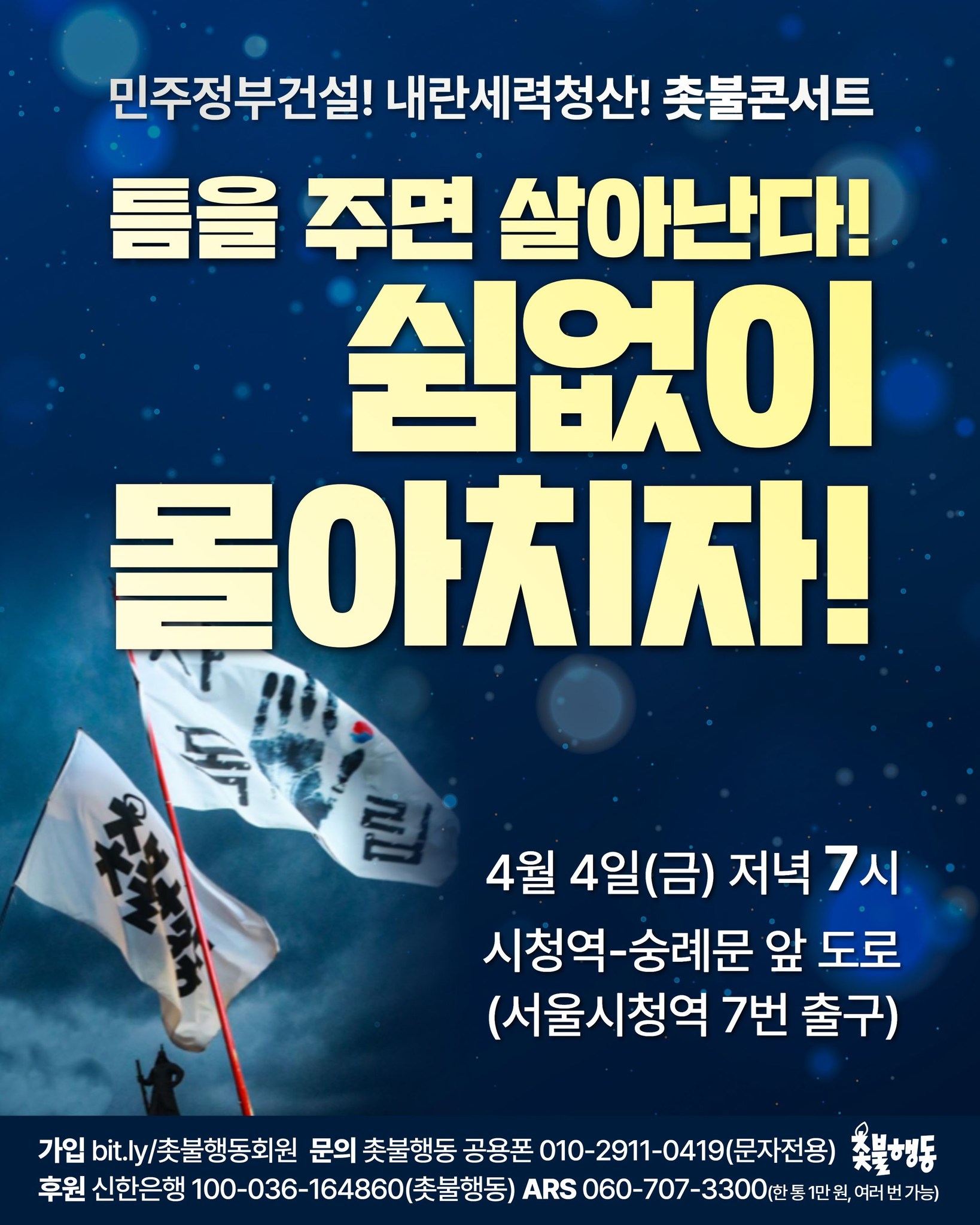 서울 4월4일(금) 7시 시청역-숭례문 대로(시청역 7번출구) 민주정부건설 내란완전청산 촛불콘서트 --> 장소 유의