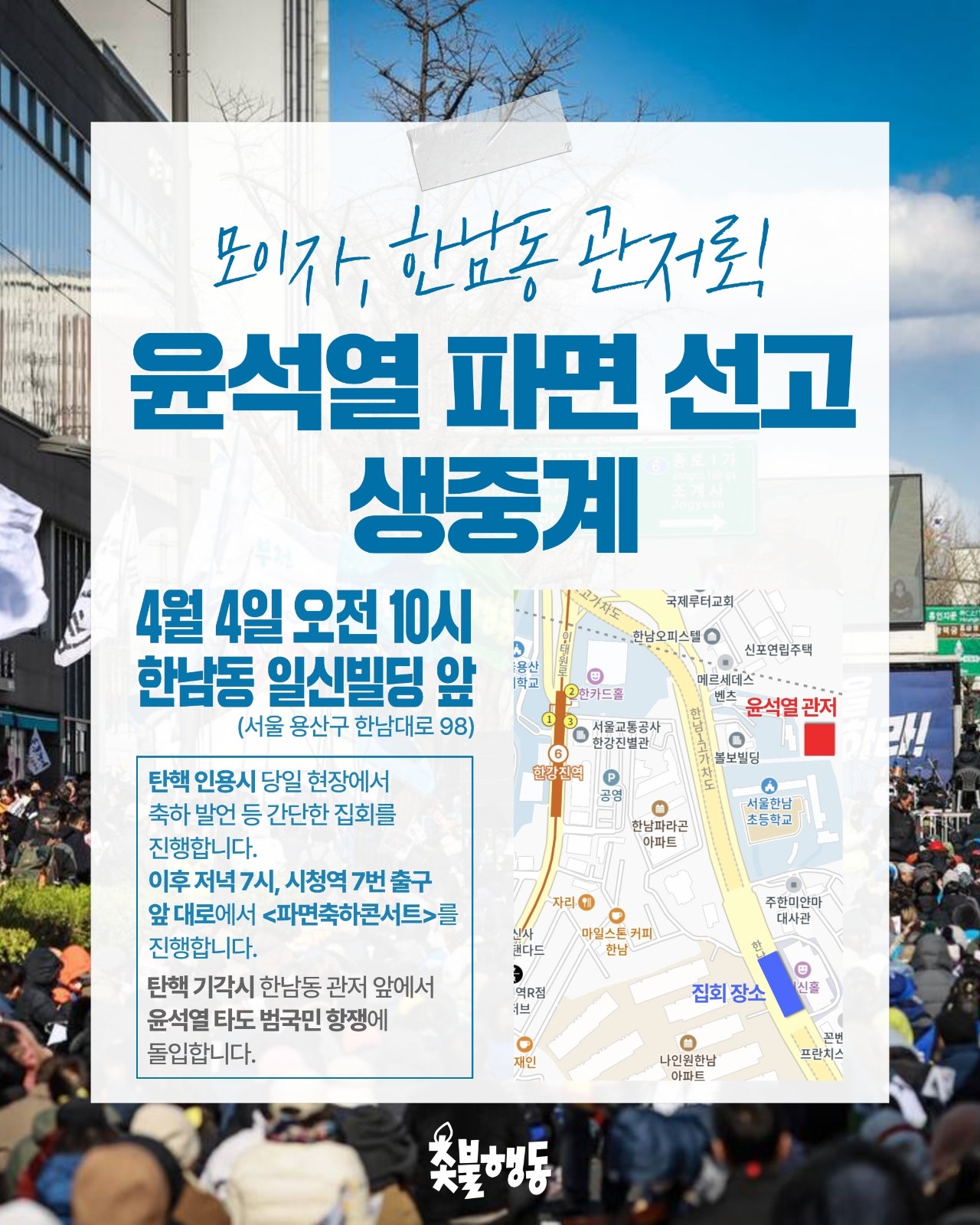 서울 용산 4월4일(금) 오전10시 한남동 일신빌딩 앞(한남대로98) 윤석열 파면 선고 생중계