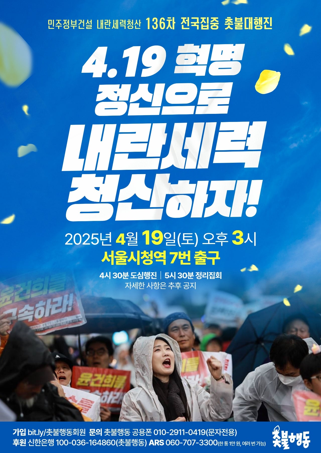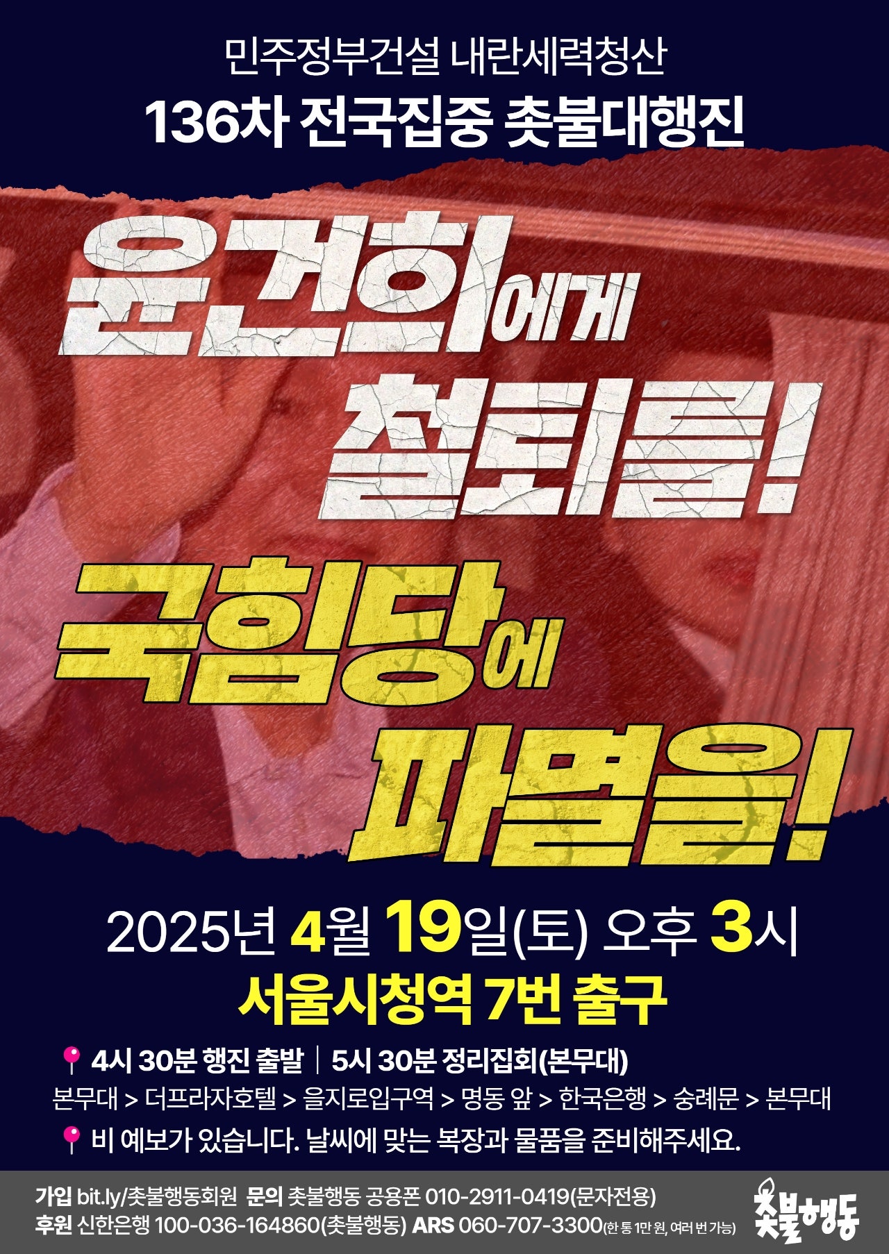 4월19일(토) 3시 시청역 7번출구 앞 대로 내란청산 136차 전국집중 촛불대행진 집회 일정