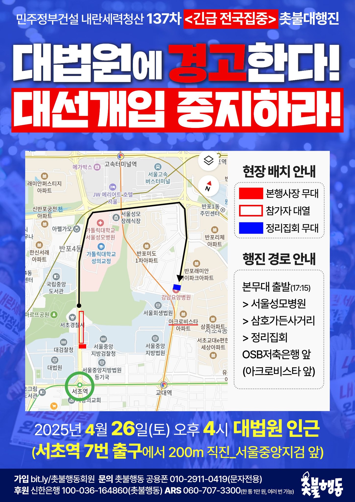 4월26일(토) 4시 대법원 인근 내란청산 137차 긴급전국집중 촛불대행진 집회 일정