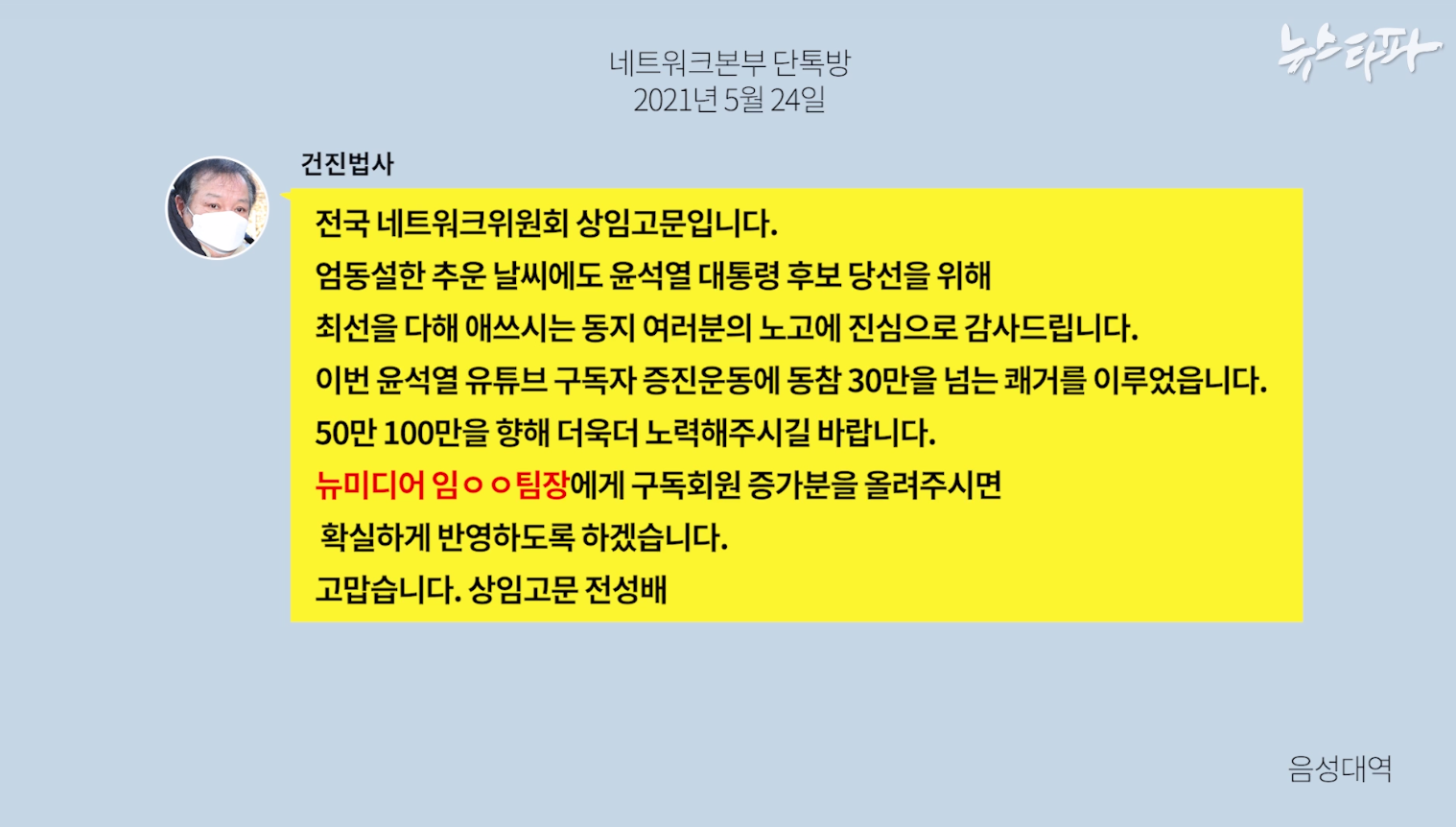 임 팀장이 대선 때 맡은 직함은 네트워크본부 뉴미디어팀장이다. 건진법사는 대외적으로는 네트워크본부 상임고문이었지만, 실제로는 네트워크본부를 이끌었다. 이를 뒷받침하는 카톡 내역이 검찰 수사보고서에서 확인된다. 건진법사와 임 팀장은 상하관계였다.
