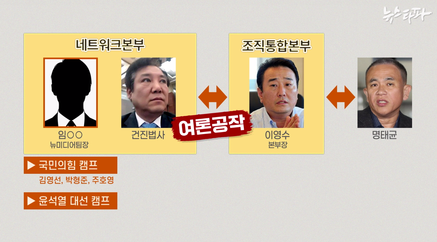 지난 대선 당시 윤석열 캠프에서 여론공작용 단톡방을 운영한 이영수 조직통합본부장을 명태균 씨가 캠프로 찾아가 직접 만난 것으로 확인됐다. 명 씨와 이영수의 만남을 주선한 인물은 건진법사 전성배 씨가 이끈 네트워크본부 뉴미디어팀장 임 모 씨였다. 임 씨를 중심으로 명태균과 이영수, 건진법사가 연결된 건데, 이들이 어떤 목적을 갖고 만났는지 규명이 필요해 보인다.