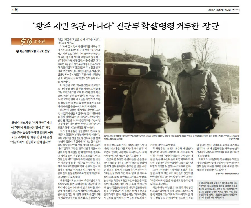 고 이구호 장군에 관한 <한겨레> 지면 기사(2021년 5월19일치). <한겨레>가 이 지면 제목에 활용한 글꼴은 5·18 민주화운동 당시 민중언론 <투사회보>의 필경을 담당한 박용준 열사의 글씨체다. 광주 5·18 시민단체는 박 열사의 글꼴을 컴퓨터 서체로 제작, 무료 보급해 민주화를 외치다 계엄군의 총탄에 산화한 박 열사의 정신을 기릴 계획이다.