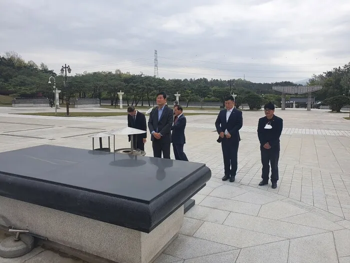 5·18 때 군의 전차 동원 지시를 거부한 고 이구호 장군의 장남 이상우(맨 앞)씨가 국립5·18민주묘지를 참배하고 있다.이상우씨 제공
