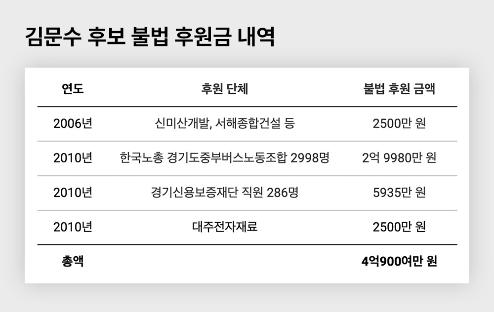 앞서 뉴스타파는 김 후보가 과거 ▲경기신용보증재단 직원 286명으로부터 5935만 원 ▲신미산개발 등으로부터 2500만 원 ▲한국노총 경기도중부버스노동조합 2998명로부터 약 3억 원의 불법 후원을 받은 사실을 보도했다.