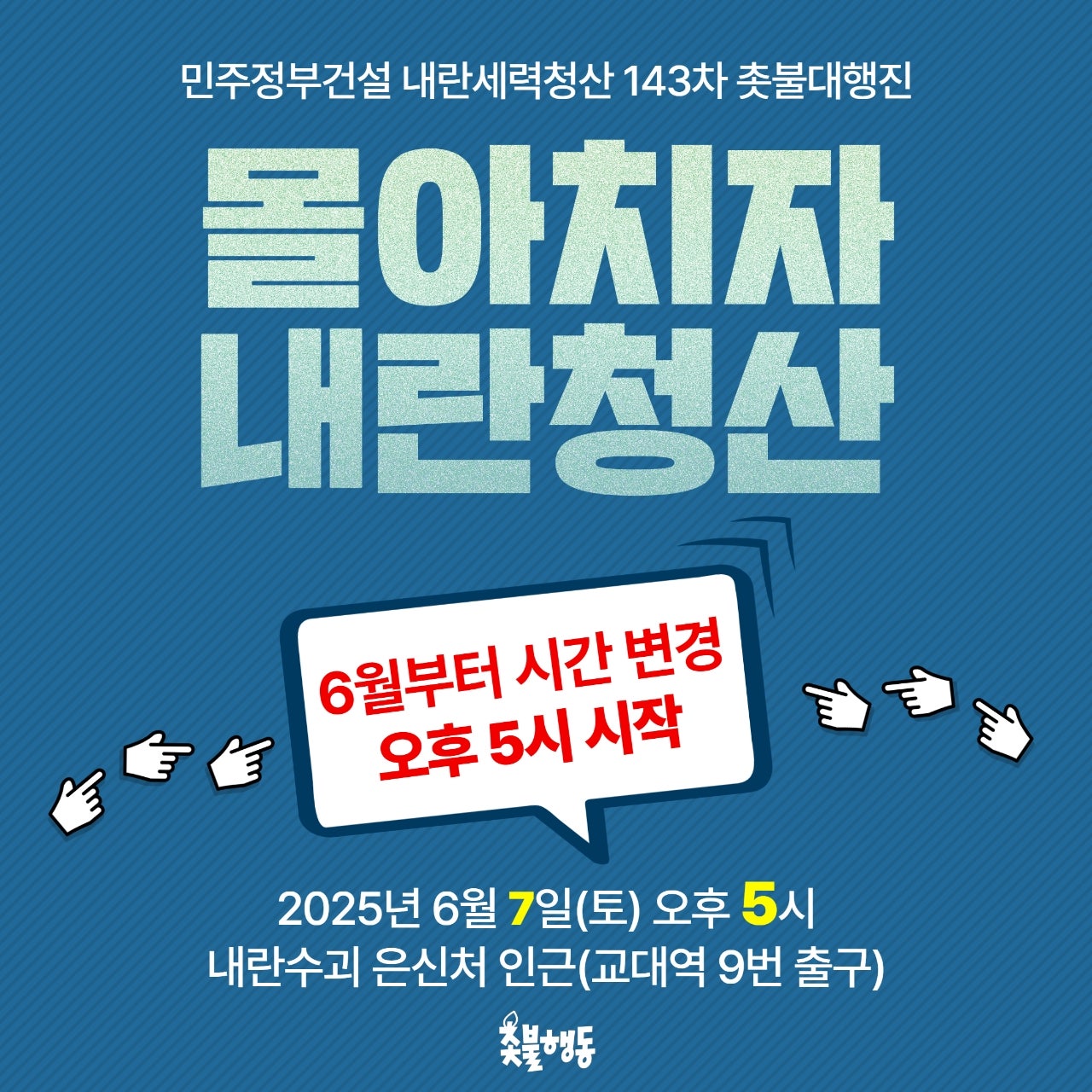 6월7일(토) 5시 교대역 내란청산 143차 촛불대행진 집회 일정