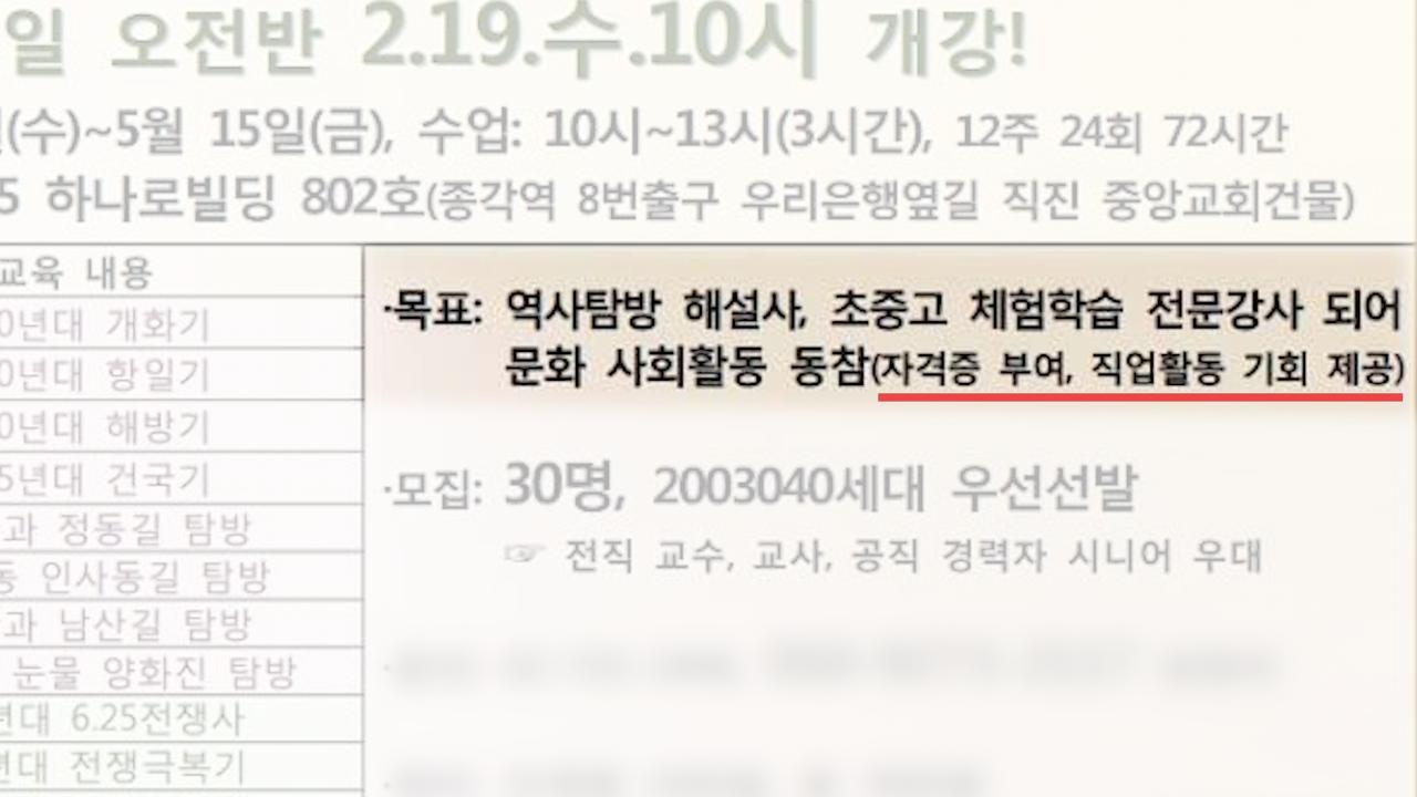 리박스쿨은 체험학습 전문강사 과정 홍보 포스터. 리박스쿨은 이 강의의 목표가 “역사탐방 해설사, 초중고 체험학습 전문 강사가 되어 문화 사회활동 동참(자격증 부여, 직업활동 기회 제공)”이라고 설명했다.