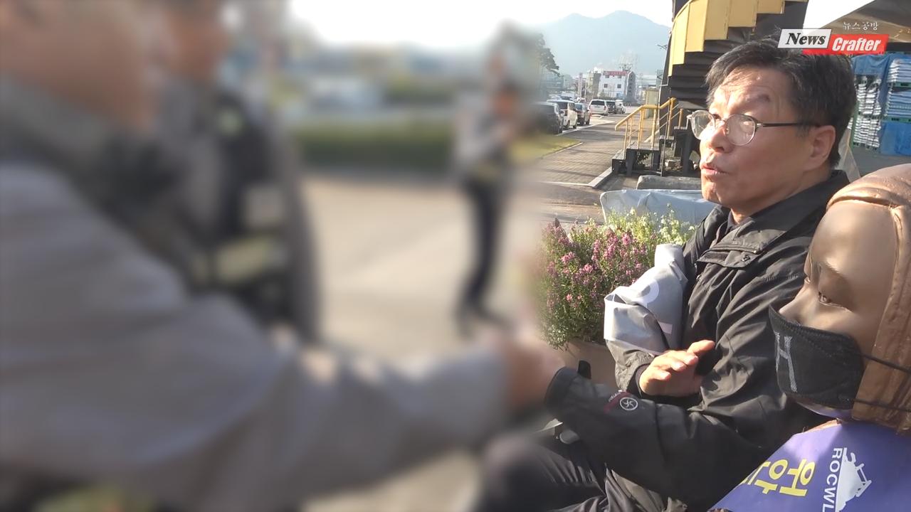 김병헌이 전남 지역 소녀상을 찾아다니며 훼손을 하는 과정에 경찰이 제지하려 했으나 막지 못 하는 모습. (출처: 뉴스공방)
