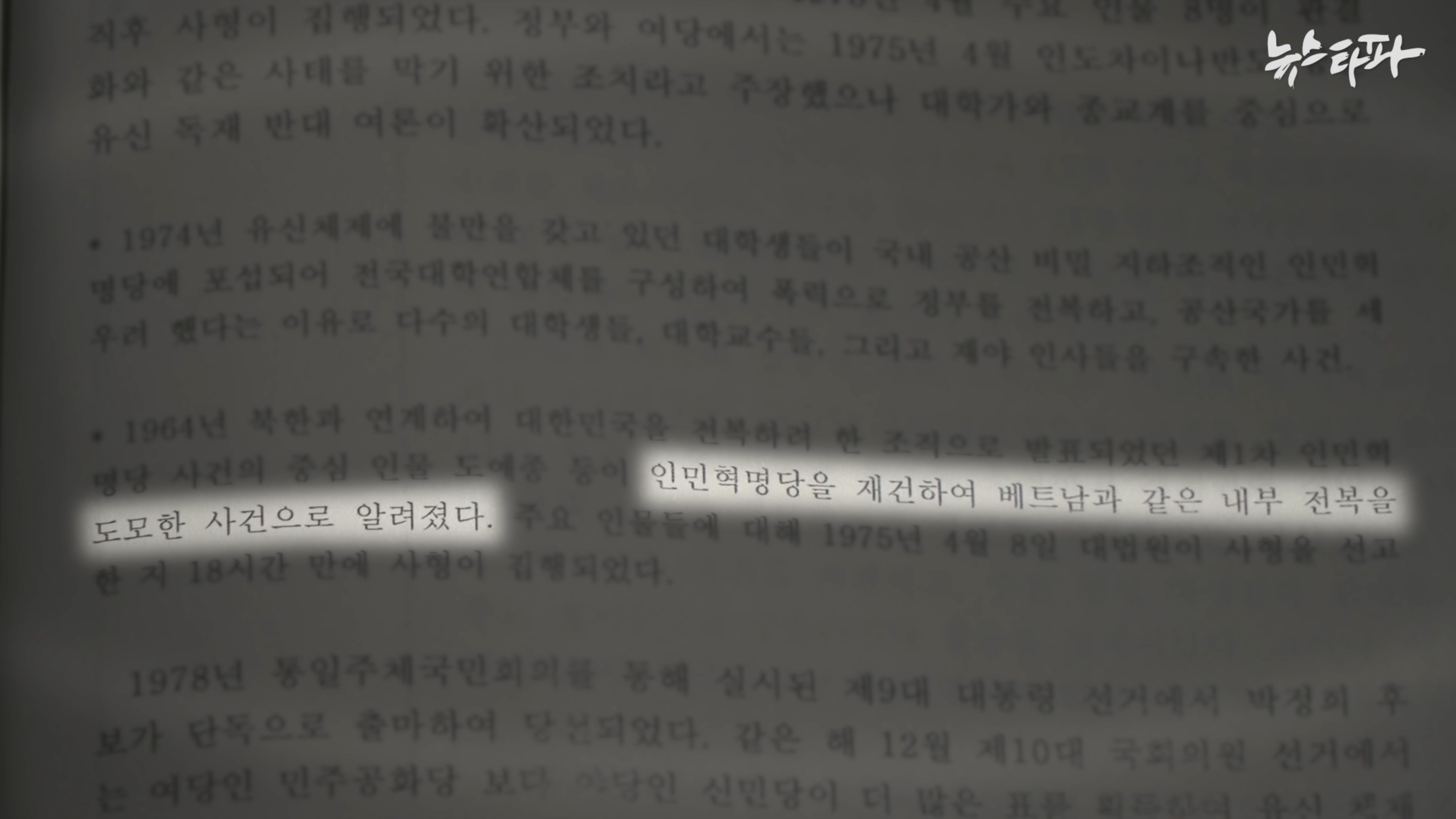 뉴스타파는 당시 제작된 교과서 원고에 이승만과 박정희 독재 정권이 자행한 민주화 세력 탄압 사건을 옹호하는 내용이 담겼다는 사실을 추가로 공개한다. 독재 정권의 간첩 조작, 사법살인으로 역사적 평가가 끝난 사건들에 대해, 여전히 논란이 있는 것처럼 교묘하게 서술한 대목들이 다수 발견된 데 따른 것이다.