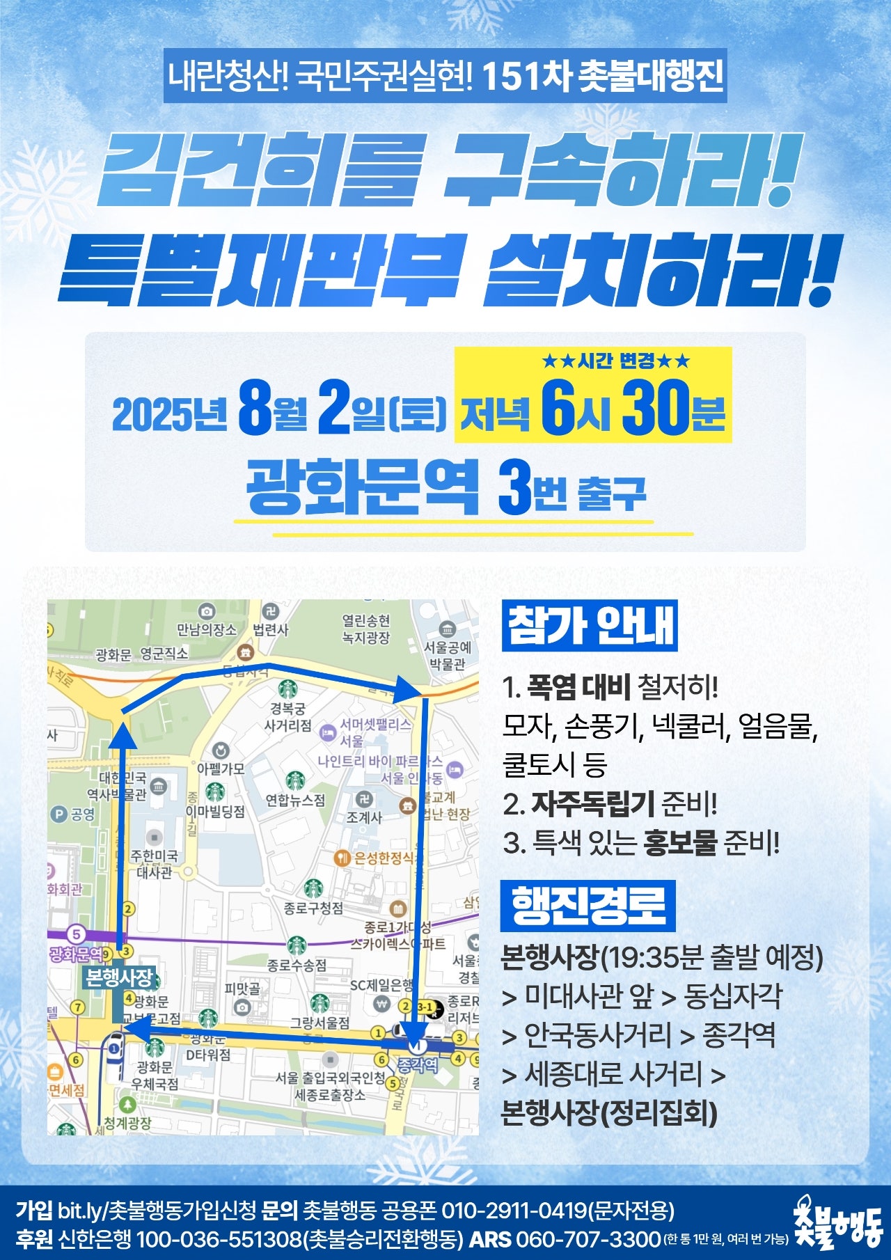 서울 8월2일(토) 6시30분 광화문역 3번 출구 151차 내란청산 촛불대행진 --> 시간 변경, 장소 유의