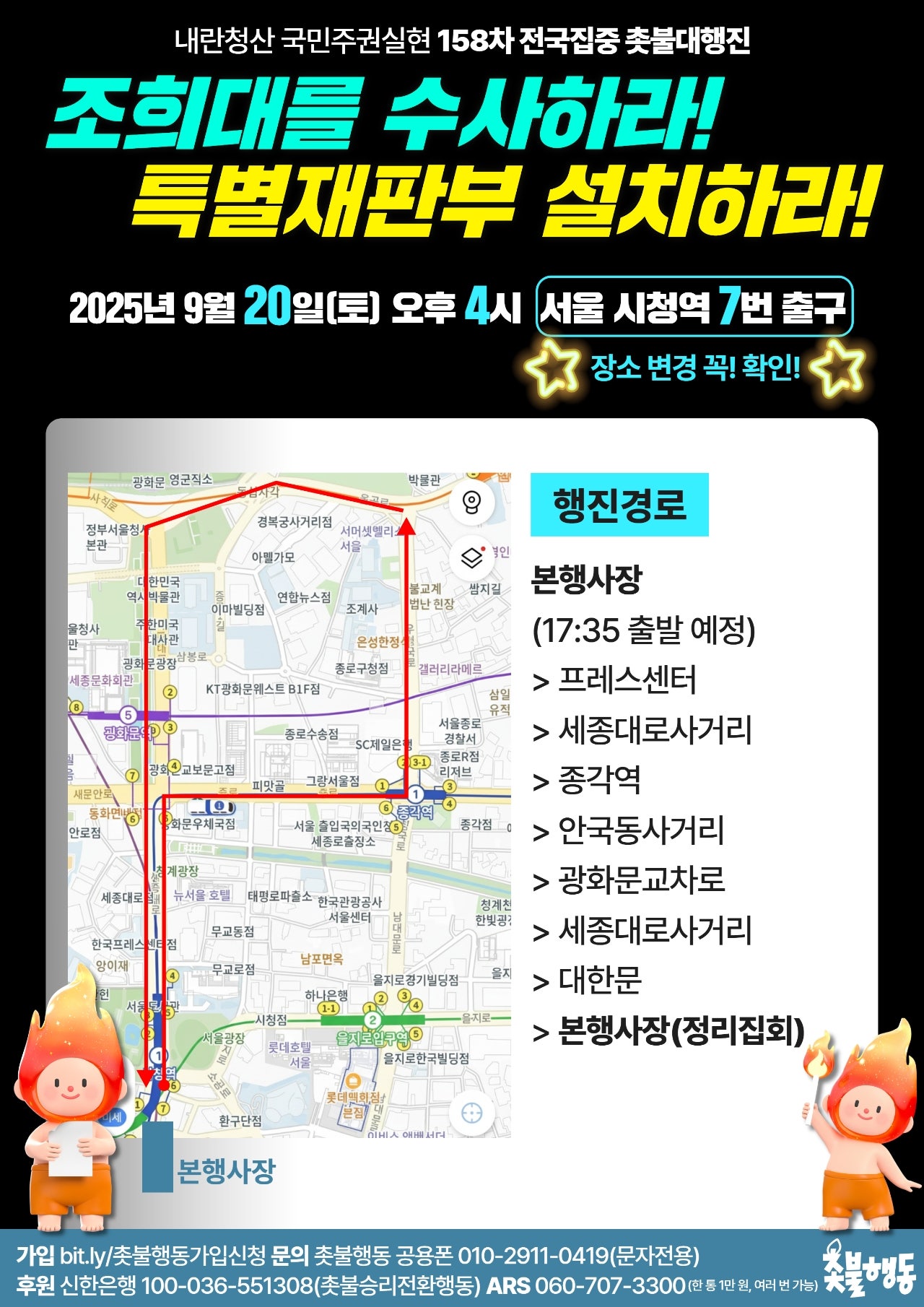 | 서울 9월20일(토) 4시 시청역 내란청산 158차 전국집중 촛불대행진 집회 일정 (장소변경) (0) | 2025.09.12 |
