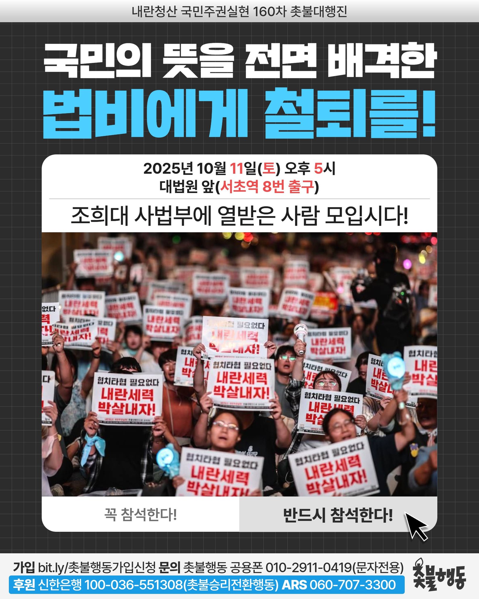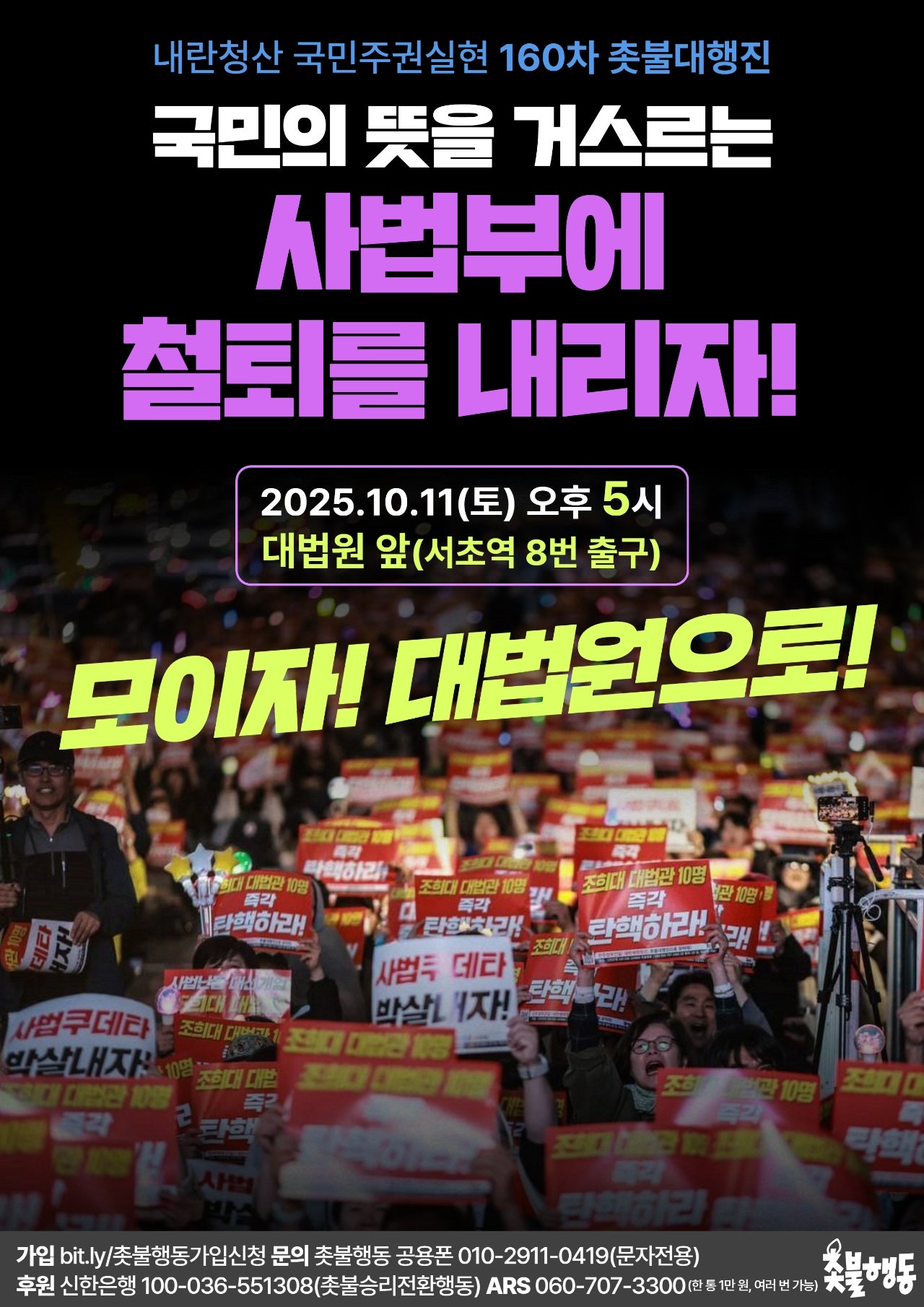 10월11일(토) 5시 대법원 앞 내란청산 160차 촛불대행진 집회 일정