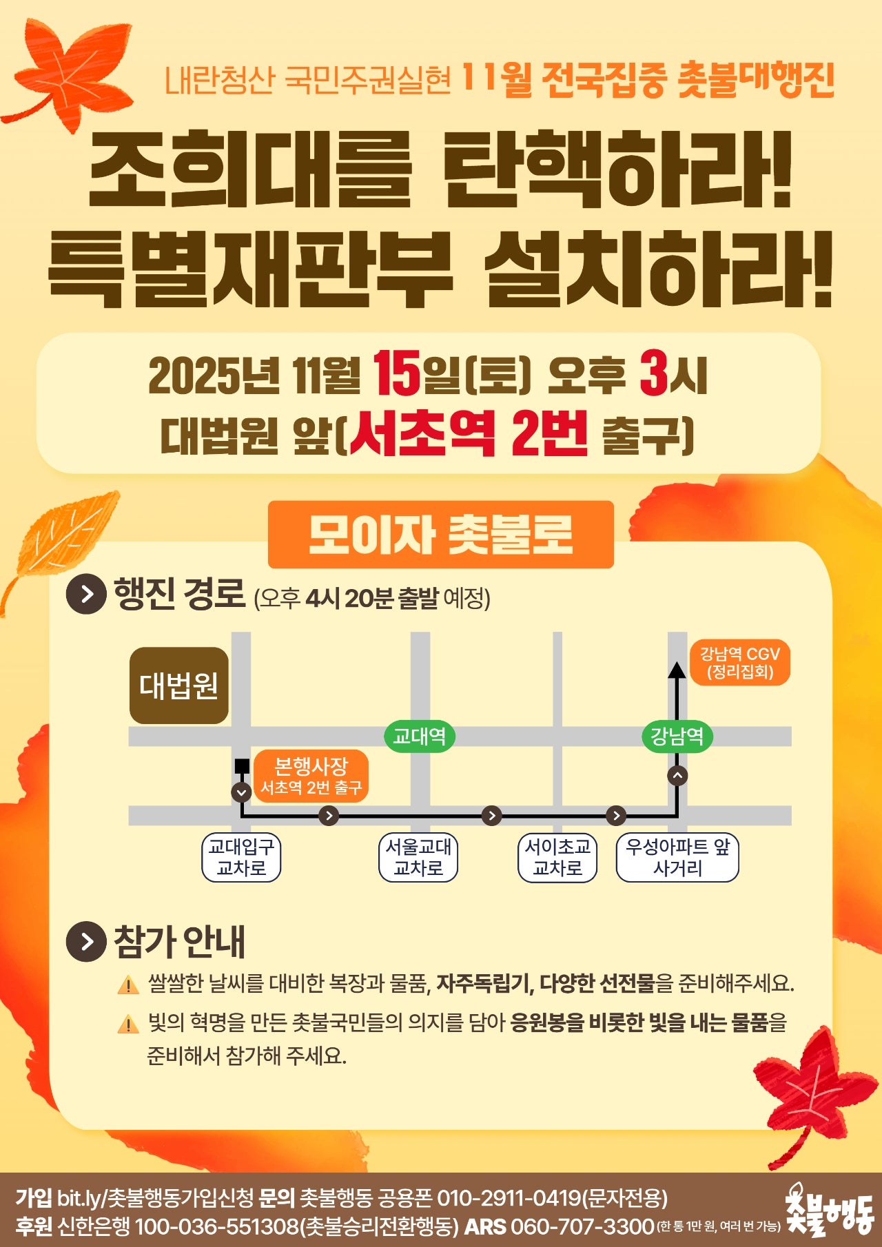 11월15일(토) 3시 대법원 앞 내란청산 165차 전국집중 촛불대행진 집회 일정