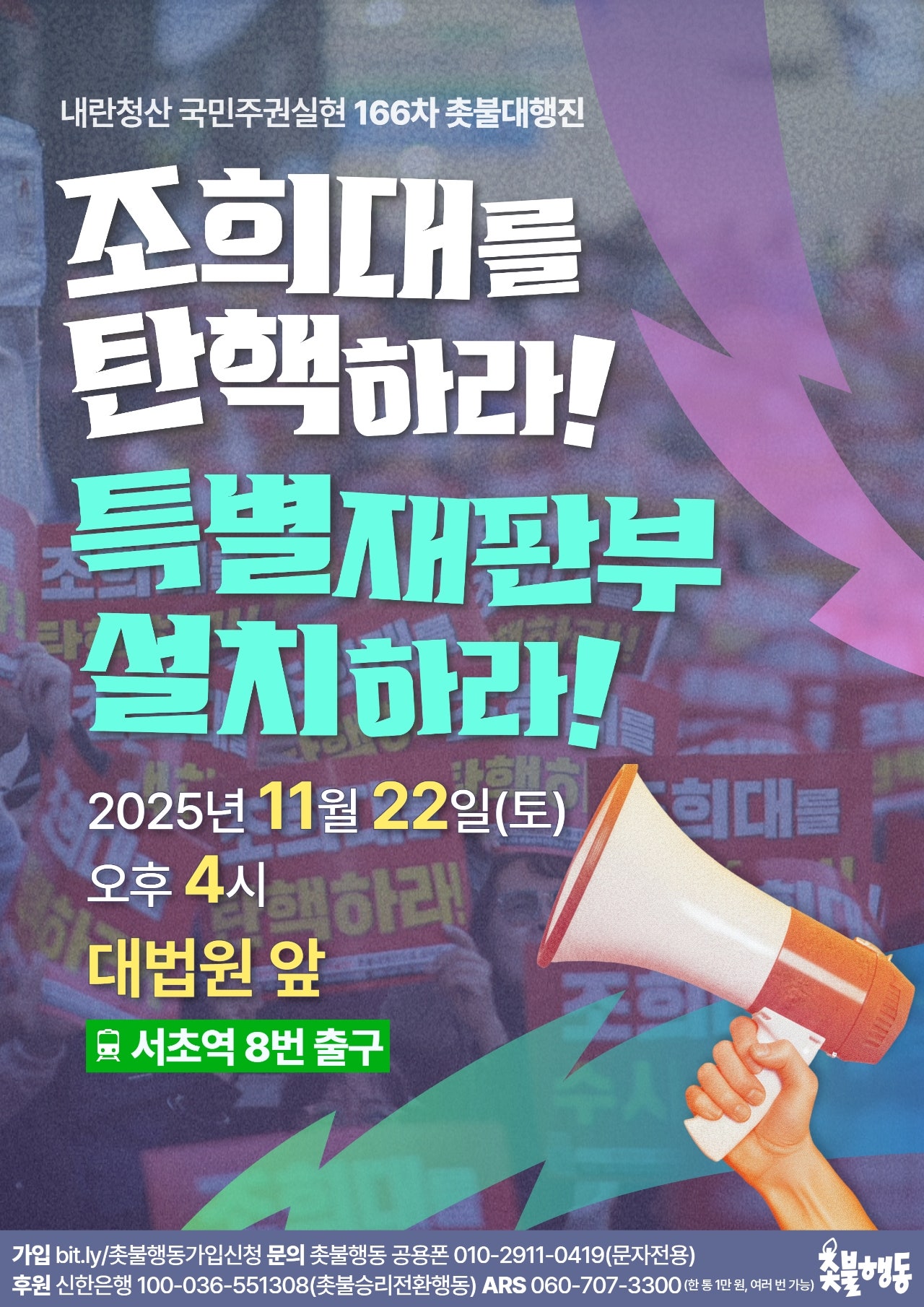 서울 11월22일(토) 4시 대법원 앞 (서초역 8번출구) 내란청산 166차 촛불대행진