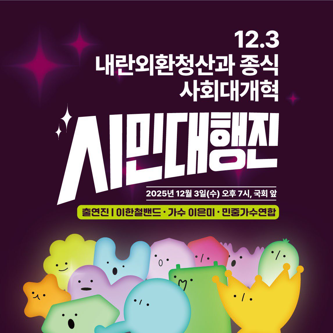 서울 12월3일(토) 7시 국회 앞 (국회의사당역 6번출구) 12.3 내란외환청산 1주년 시민대행진 --> 출구 변경