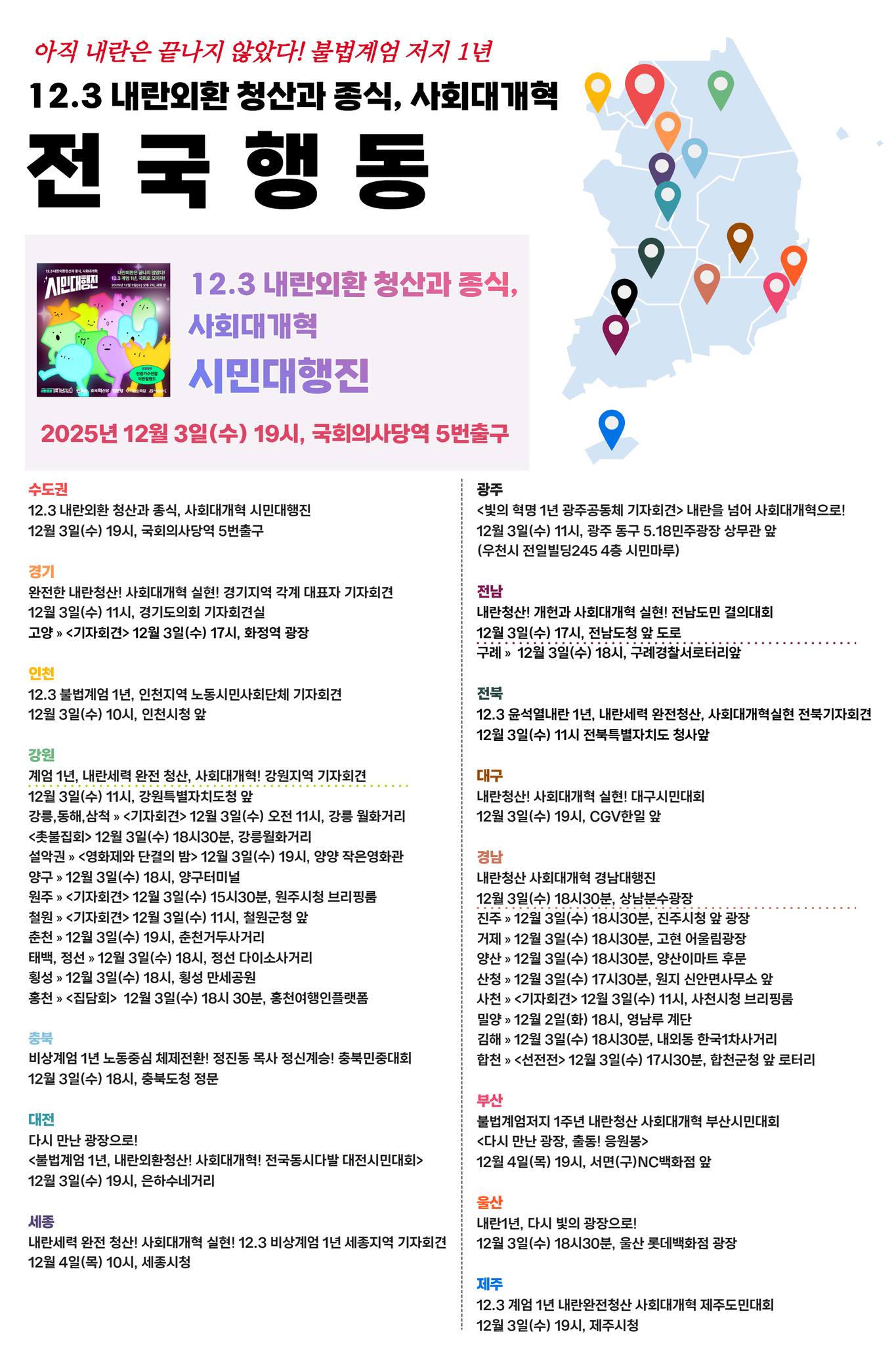 12월2일(화),3일(수),4일(목),5일(금),6일(토) 윤석열 12.3 내란저지 1주년 촛불집회 전국 일정