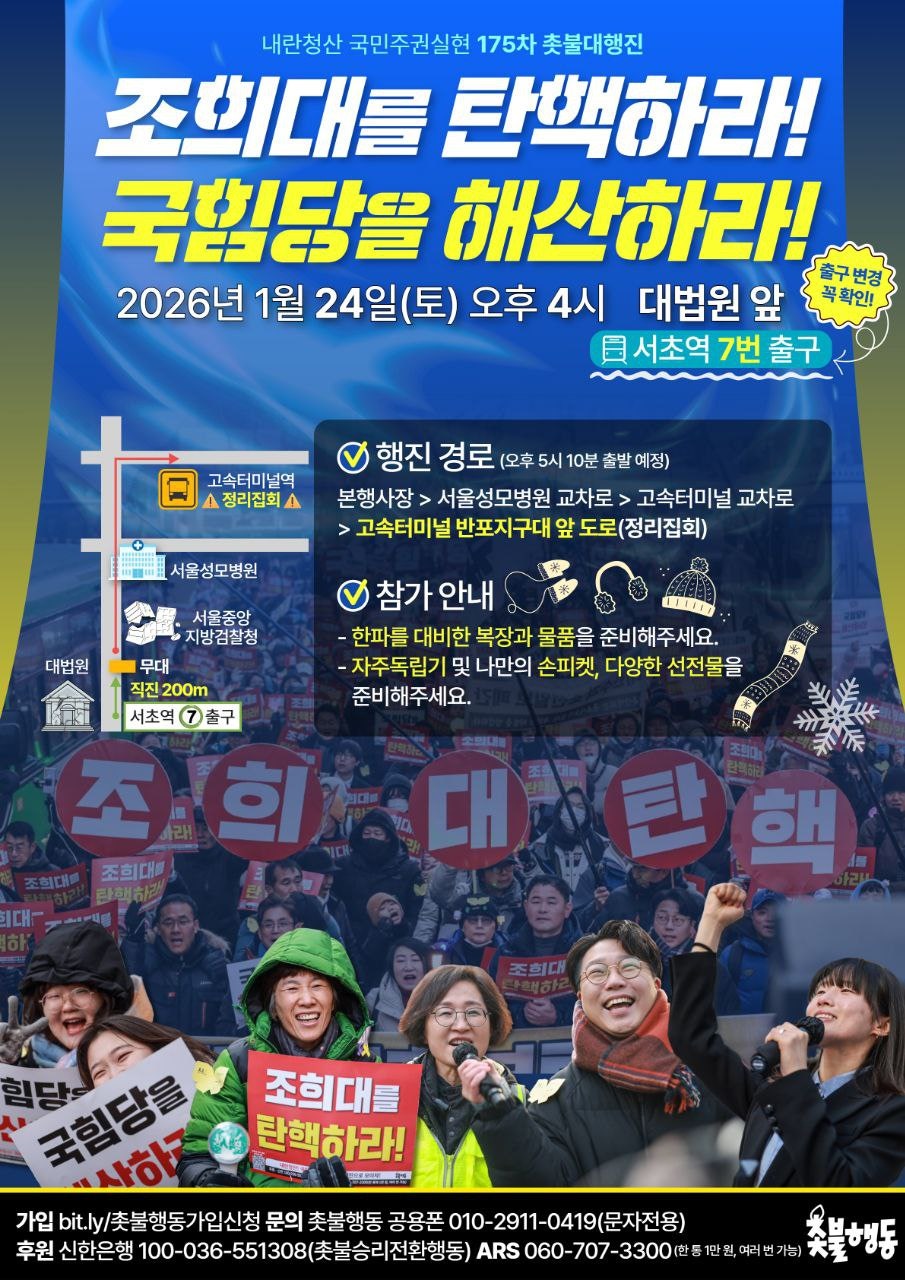 서울 1월24일(토) 4시 대법원 앞 내란청산 175차 촛불대행진 https://tadream.tistory.com/41563