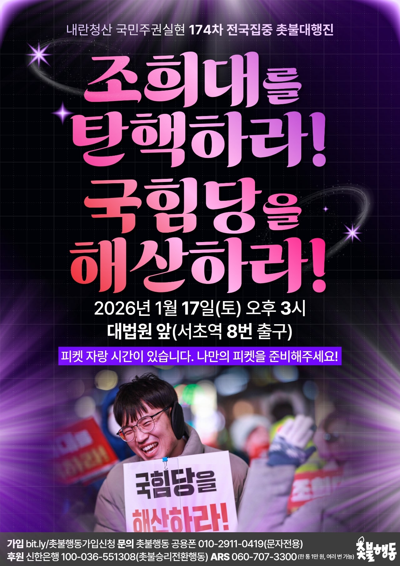 | 서울 1월17일(토) 3시 대법원 앞 내란청산 174차 전국집중 촛불대행진 집회 일정 (0) | 2026.01.07 |
