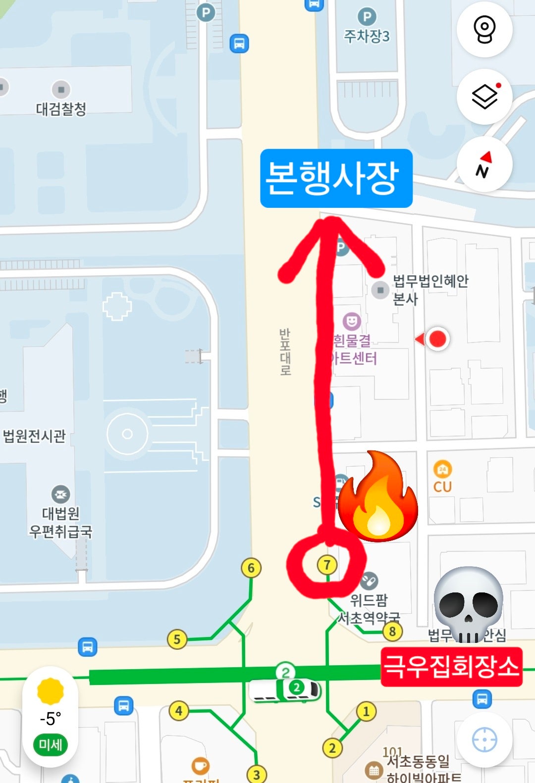 ▶ 대법원 앞 (서초역 7번 출구) --> 출구 유의