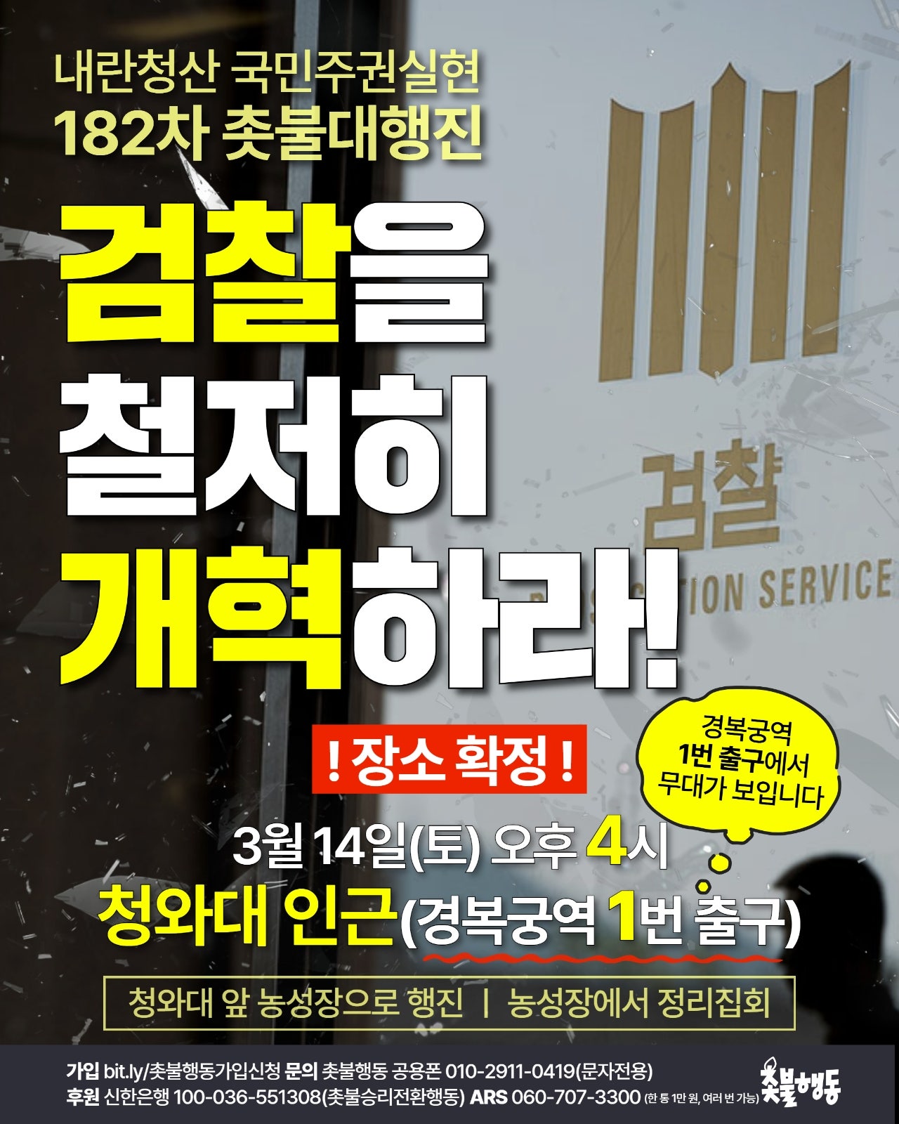 | 서울 3월14일(토) 4시 청와대 인근 내란청산 182차 촛불대행진 집회 일정 --> 장소 변경 (0) | 2026.03.07 |