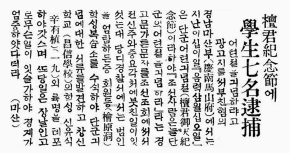 "경남 마산부에서는 지난 이십 이일 '음력 삼월 십오일'은 단군 어텬긔념절이라 하야 '조선 사람은 늘 단군의 어텬절을 긔념하라'는 경고문 가튼 문자를 조선 조희에 써서 전신주와 중요 각처에 붓친 일이 잇섯는대."
