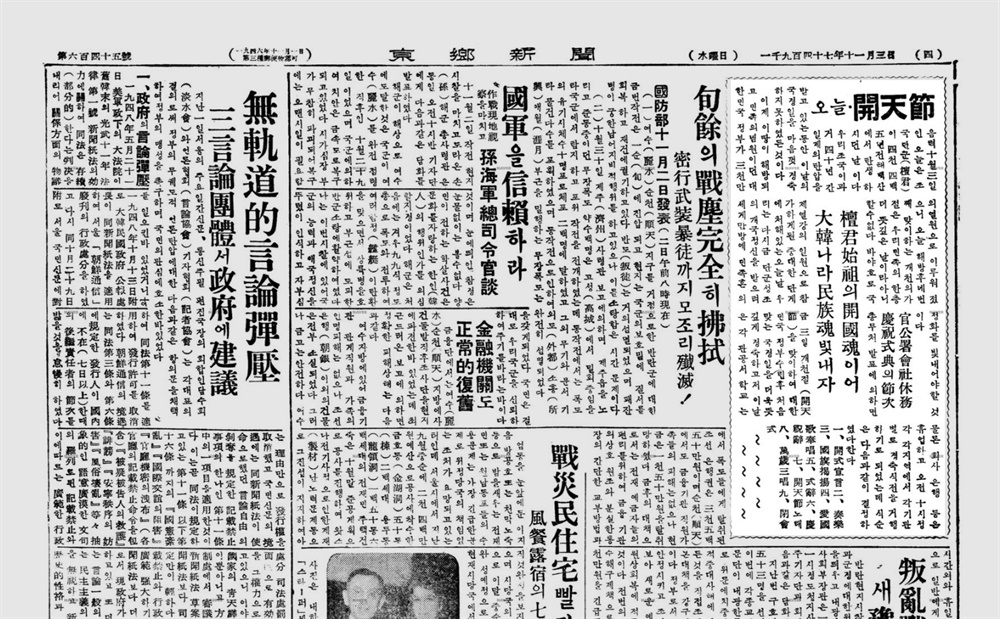 현대 한국인들은 양력 10월 3일을 개천절로 생각하지만, 1948년까지는 그렇지 않았다. 음력 10월 3일에 발행된 그해 11월 3일 자 <경향신문>에 '오늘 개천절'이란 기사가 나왔다. 이때만 해도 음력 10월 3일이 개천절이었던 것이다.
