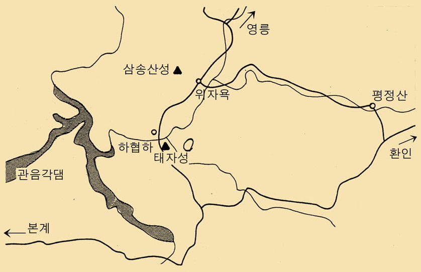 태자하 상류일대에는 고구려초기 요동평원방면의 주요 교통로인 혼강~소자하~혼하(渾江~蘇子河~渾河) 루트로 통하는 산간로가 많이 발달되어 있으며, 삼송산성(杉松山城)은 여러 산간로를 이어주는 요지임. 더욱이 1-3세기경 고구려와 중국세력은 량소지곡(梁紹之谷)이나 량구(梁口) 등 소자하(蘇子河)에서 태자하(太子河)로 나아가는 산간로 입구나 그 주변에서 치열한 공방전을 벌였음. 위의 사실과 함께 규모가 비교적 작고 산 정상에 위치하였다는 점 등을 고려하면 삼송산성(杉松山城)은 대체로 태자하(太子河) 상류일대와 소자하, 혼강(蘇子河, 渾河) 등을 연결하는 산간로를 공제(控制)하기 위한 군사방어성으로 추정됨(여호규, 1999).