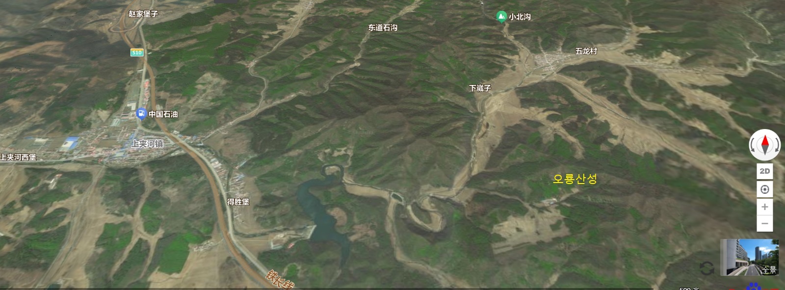 산성 북쪽에는 오룡촌으로 향하는 도로가 있음. 서쪽으로 3㎞ 떨어진 지점에 득승수고가 있음. 서북쪽으로 15㎞ 떨어진 지점에 남잡목진이 있음. 산성에서 남쪽으로 5㎞ 떨어진 지점에 소자하가 있음. 산성 북쪽은 오룡하 연안의 경작지임. 동면 절벽 아래 산골짜기에는 과수원이 있음. 남쪽은 개활한 황수배자구(荒樹排子溝)임. 서쪽으로는 황수배자구 입구를 사이에 두고 관문립자산과 마주 보고 있음.