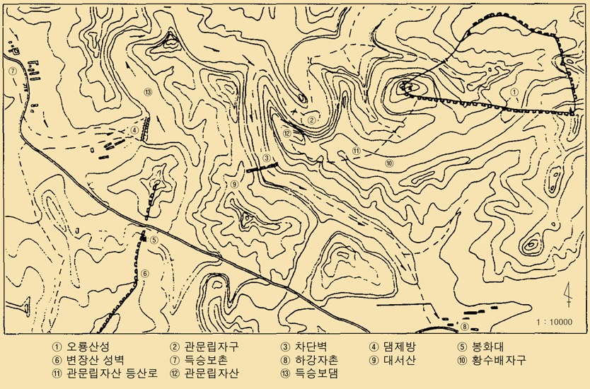 오룡산성 서쪽의 현재 도로는 변장산(邊墙山)을 비롯하여 동북~서남 방향의 산등성이를 여러 개 가로질러 지나가고 있음. 그런데 1930년대의 지형도를 보면 당시에는 아직 개설되지 않았고, 하협하진에서 오룡하를 거슬러 올라올 경우, 오룡하 상류를 따라 득승보(得勝堡)댐 협곡을 거쳐 관문립자(關門砬子) 골짜기 입구를 지나 대서산(大西山)~관문립자산(關門粒子山) 사이의 협곡로를 통해 하강자촌(下岗子村)으로 향했던 것으로 그려져 있음. 즉 적군은 오룡산성의 서변을 지나쳐서 소자하 방면으로 진공하였고, 이때 오룡산성 자체만으로는 충분한 방어벽을 형성할 수 없었음. 대서산~관문립자산 협곡로의 차단벽과 변장산의 성벽은 이러한 점에서 주목됨. 득승보촌(得勝堡村)올 지난 적군이 오룡하 상류와 대서산~관문립자산 협곡로를 통해 소자하 방면으로 진입할 경우, 득승보 협곡 입구가 제1방어선, 관문립자 골짜기 입구와 대서산~관문립자산의 차단벽이 제2·3 방어선을 형성하였을 것으로 추정됨. 그리고 변장산의 성벽은 변장산 산줄기를 가로질러 곧바로 하강자촌으로 향하는 적군을 막는 방어선으로 기능하였을 것임. 오룡산성은 지형조건상 산성 자체만으로는 방어체계에 결함이 있었기 때문에 변장산의 성벽을 비롯하여 득승보협곡(得勝堡峽谷) 입구, 관문립자 골짜기 입구, 대서산~관문립자산 협곡로 등에 차단벽을 축조하여 총체적인 방어체계를 구축한 것임(여호규, 1999).