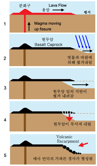용암에 의한 메사의 형성 과정의 예