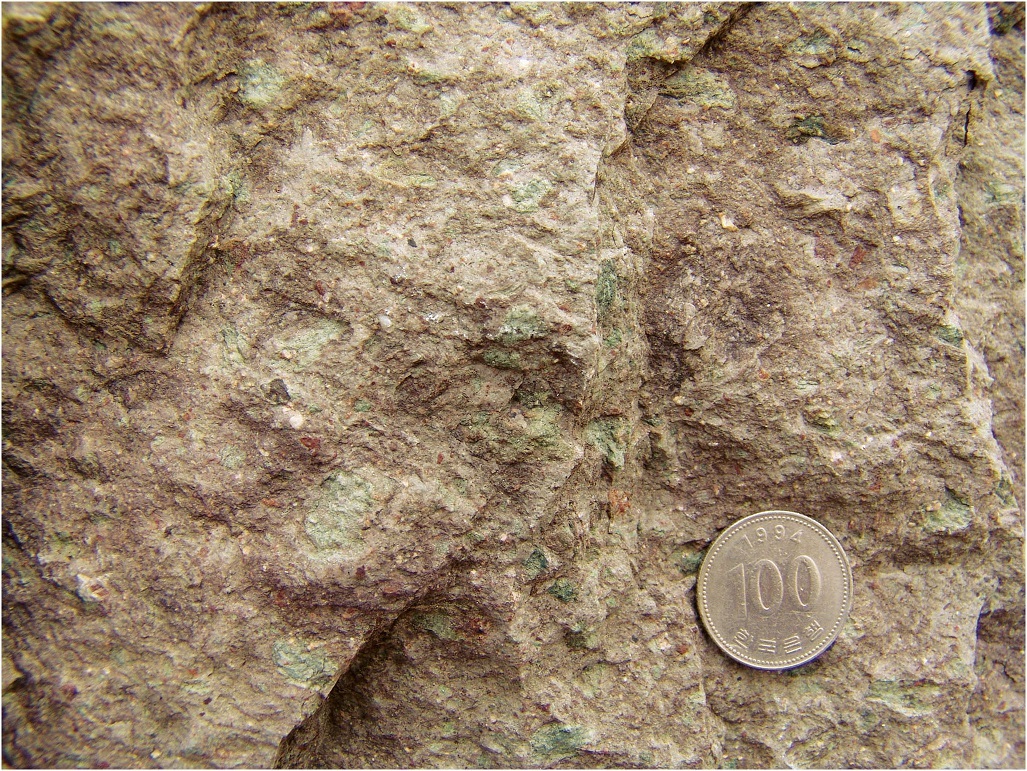 [그림 37] 기질부에 녹색의 부석편을 가지는 래필리 용결 응회암