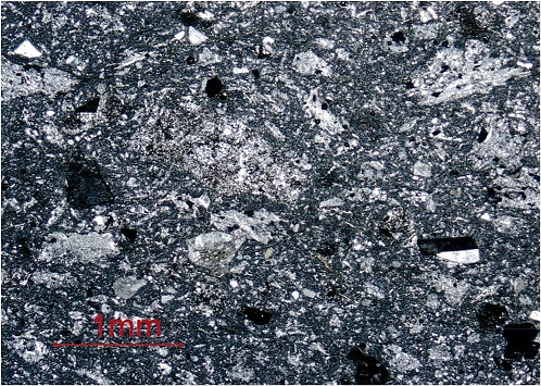 [그림 40] 오녀산성 하단부의 데사이트질 래필리 용결 응회암(직교니콜)