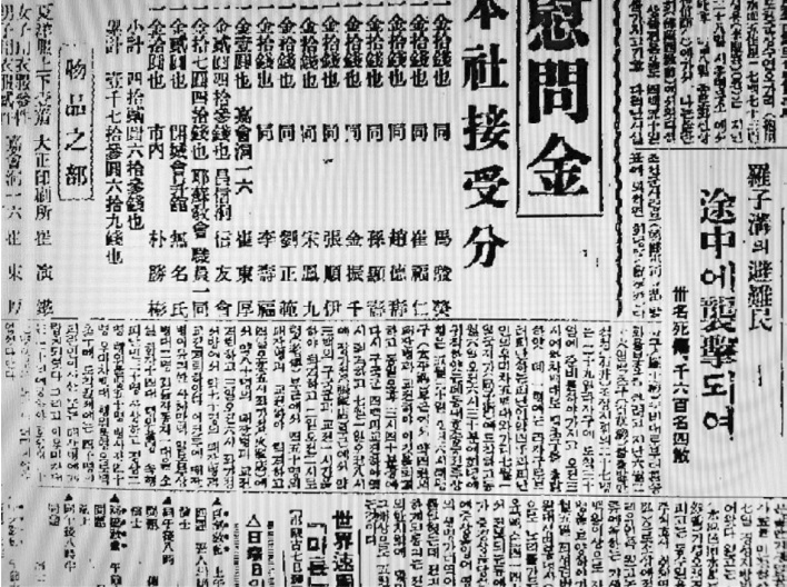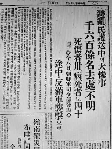 23) 「피란민 호송중의 대참사 천육백여명 거처 불명 사상자 30, 병사자도 40」, 「동아일보」 1933.7.9.(석간). 2면.