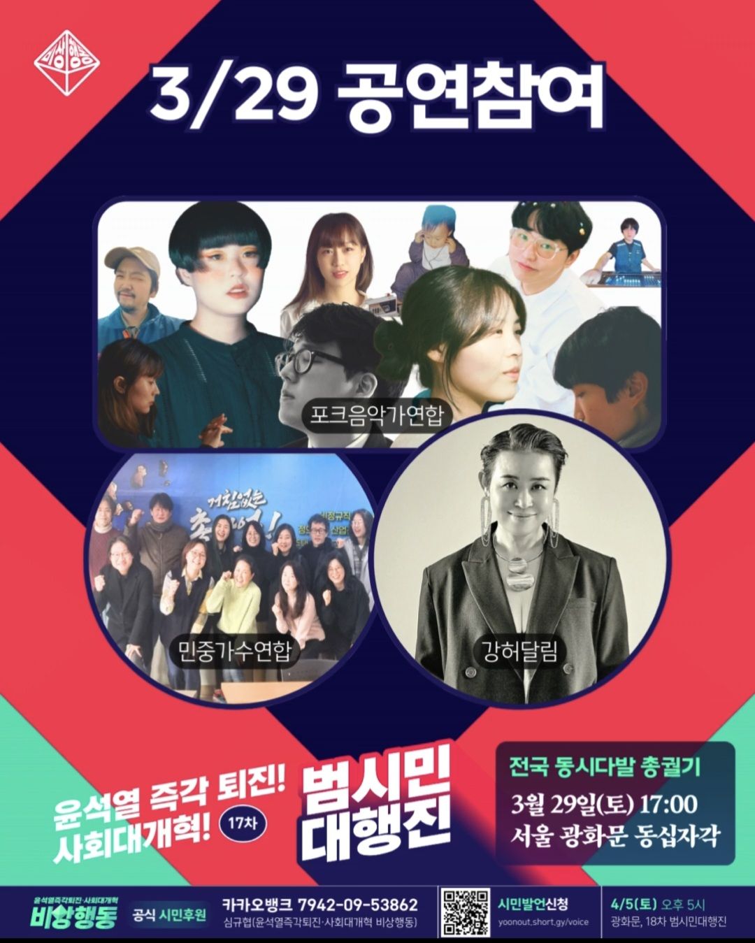 3월29일(토) 5시 광화문 윤석열 즉각 퇴진 17차 범시민대행진 집회 일정