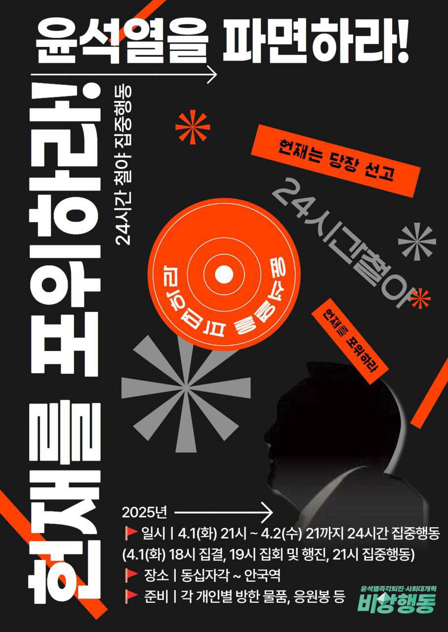 서울 4월1일(화) 6시 광화문 동십자각 헌재 포위, 윤석열 파면 24시간 집중행동