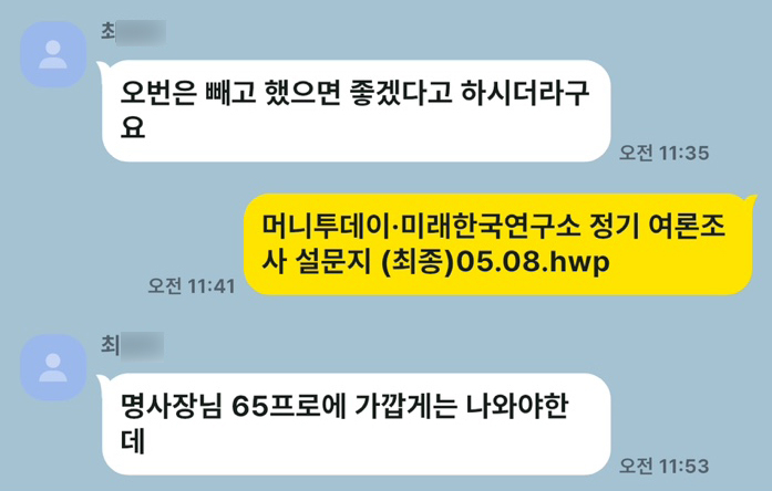 그런데 '명태균PC'에는 '명태균 여론조사'의 실질적인 의뢰인, 즉 '진짜 고객'이 다름아닌 홍 후보였음을 가리키는 카카오톡 메시지가 포함됐다. 명 씨의 카톡 대화 상대방은 홍준표의 양아들로 불리다, 지난해 대구시에 취업한 최모 씨였다.