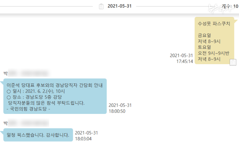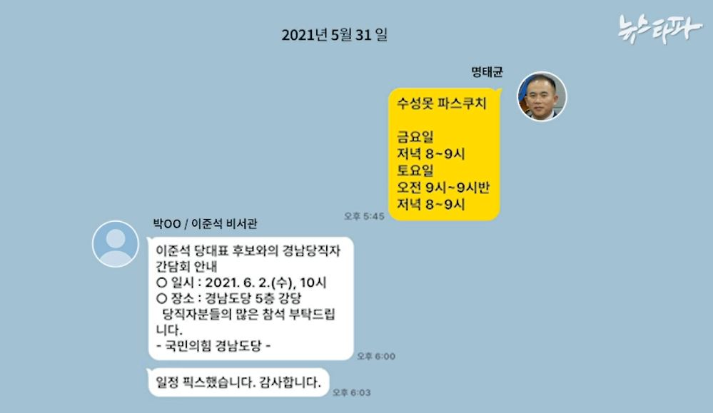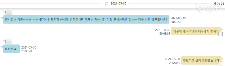 "명 사장님 이준석 후보 비는 시간이 언제인지 한 세 개 알려주시면 대표님 되는 시간이랑 맞춰볼게요. 장소는 대구 서울 상관없나요?"