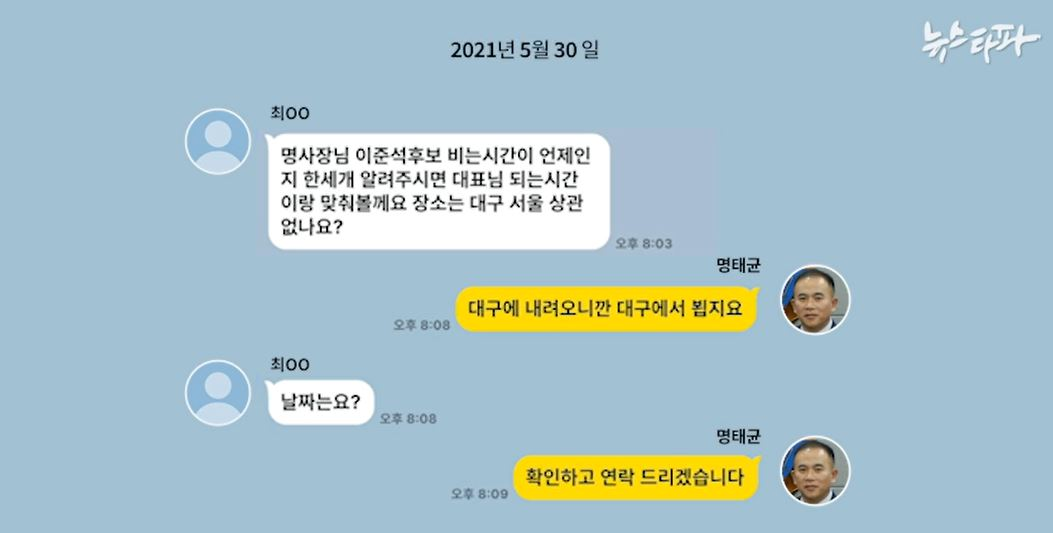 여기서 '대표님'은 자유한국당 대표를 역임한 홍 후보를 언급할 때 측근들이 쓰는 호칭이다. 이날 카톡에서 최 씨는 '3자 회동' 약속 시간과 장소 조율을 요청했고, 명 씨는 "(이준석이) 대구에 내려오니깐 대구에서 뵙지요"라고 답했다.