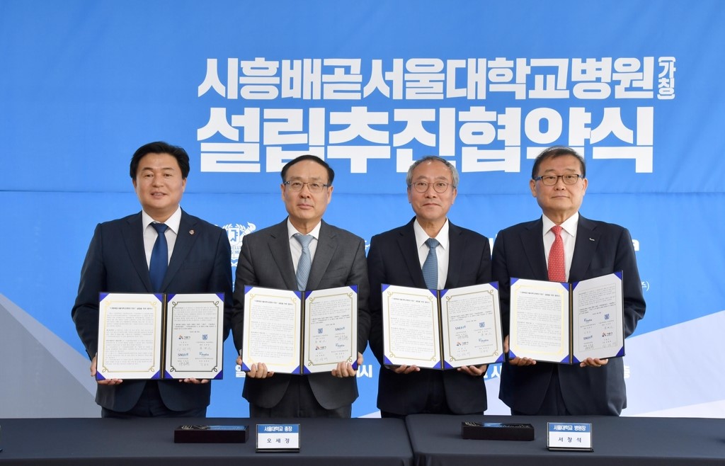 - 2019년 5월 30일 열린 '시흥배곧서울대학교병원 설립 추진 업무협약식. 오세정 서울대 총장, 임병택 시흥시장, 서창석 서울대병원장, 서울대 시흥캠퍼스 시공사 정몽원 ㈜한라 회장이 참석했다. 서울대 자료.