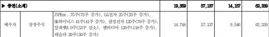 JYP엔터와 LG전자, SK하이닉스, 테슬라를 신규로 샀고, 삼성전자, 엔비디아도 더 사들였다. 지난해 주식 증가액은 5천700만 원으로 총 6천200만 원 가치의 주식을 보유했다고 신고했다.