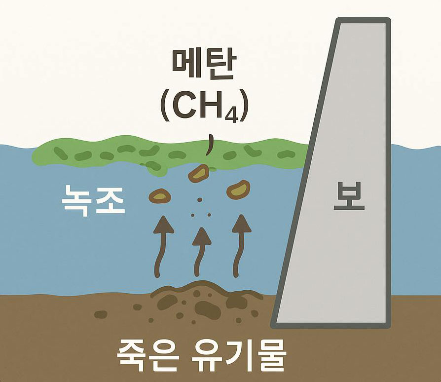낙동강은 8개의 보가 연속으로 설치돼 있어 흐름이 느려지고, 여름철 수온이 오르면 녹조(남세균)가 급격히 번식한다. 녹조는 광합성을 하기 때문에 일시적으로 이산화탄소(CO₂)를 줄이지만, 일정량을 넘어서면 오히려 문제가 된다. 죽은 녹조가 썩으면서 유기물이 강바닥에 쌓이고, 이 유기물이 산소가 거의 없는 바닥층에서 분해되는 과정에서 특수한 고세균에 의해 메탄이 생성된다.