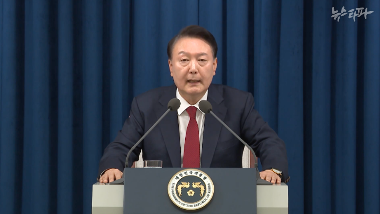 2024년 12월 3일 밤 비상계엄을 선포하고 있는 당시 대통령 윤석열의 모습.